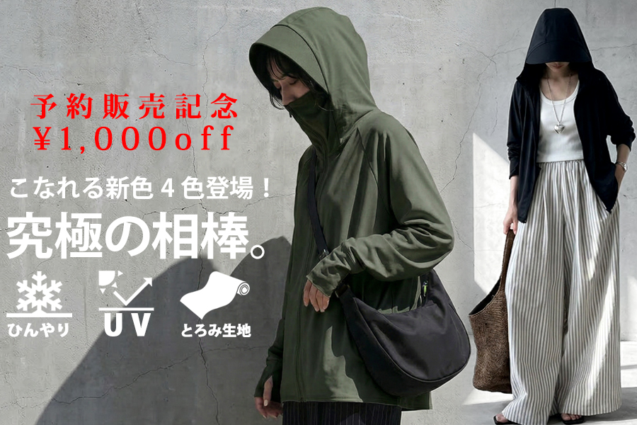 ラッシュガード\1,000OFFUVカット率99.7%×接触冷感。顔まわりまで守る立体フードで、日差しを徹底ブロック。ひんやり心地よく、通勤もレジャーも頼れる一枚。今なら【1,000円OFF】の緊急予約発売。“絶対焼けたくない”に、本気で応えるパーカー。 -