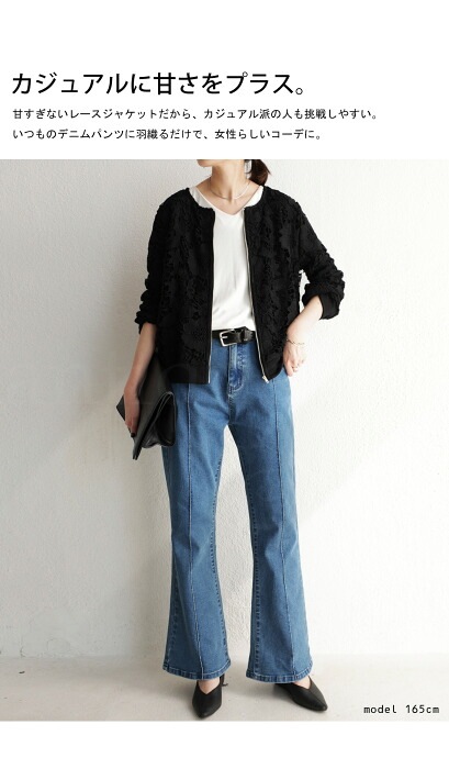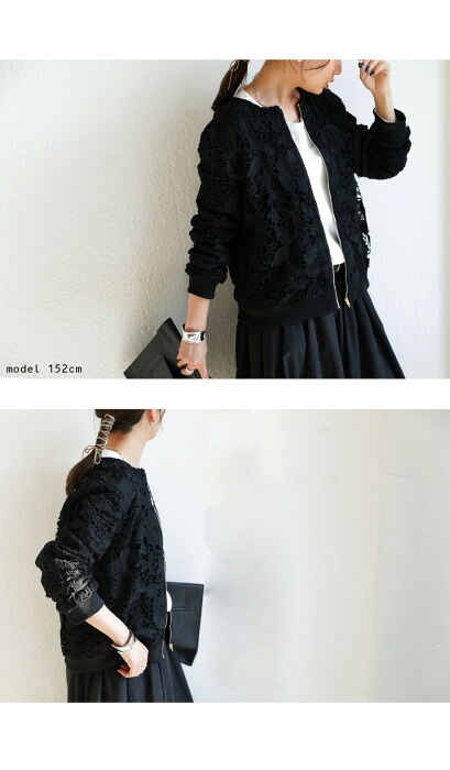 ブラックの大柄レースだから甘すぎずデイリーにもフォーマルにも使える、レディースジャケット。