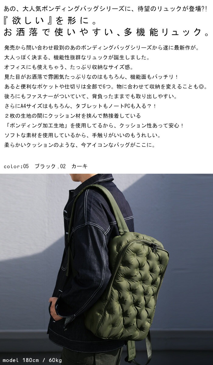 【検索ワード】ボンディングリュック リュック メンズ 鞄 キルティング クッションバッグ A4 スクエア ノートPC タブレット カメラ機器 軽量 多機能 キルティングバッグ ボンディング クッション ソフト BAG 高級感 ユニセックス 通勤 通学 オフィス ブラック カーキ バッグ カバン かばん 男性 男 かっこいい カッコイイ カジュアル antiqua treecafe アンティカ ツリーカフェ メンズファッション トレンド コーディネート 通販 ブランド 春 夏 秋 冬 オールシーズン あんてぃか