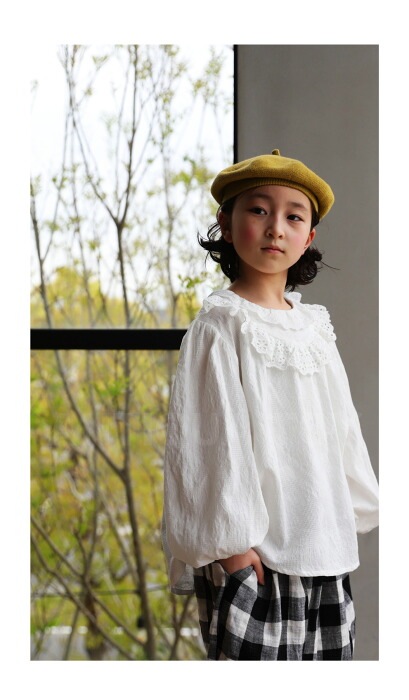 。 襟元にナチュラルな綿レースをあしらったブラウスは軽やかで上品な印象も。