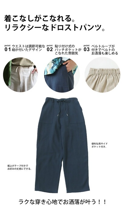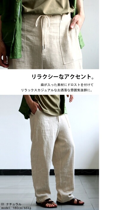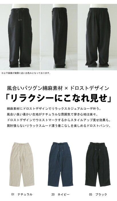 【検索ワード】BES 綿麻 ドロストパンツ パンツ メンズ ボトムス 無地 ゆったり ワイド テーパード ワイドパンツ テーパードパンツ シンプル 長ズボン 綿 麻 コットンリネン カシメ チクチクしない ベルトループ 後ろゴム 裾上げテープ付き 大きいサイズ ユニセックス 男性 男 かっこいい カッコイイ カジュアル antiqua artichoke アンティカ アーティチョーク メンズファッション トレンド コーディネート 通販 ブランド 春 夏 あんてぃか