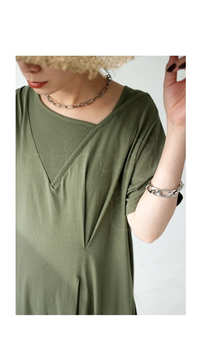 リブの切替が入ったネックラインにタックがアクセントになった一着。