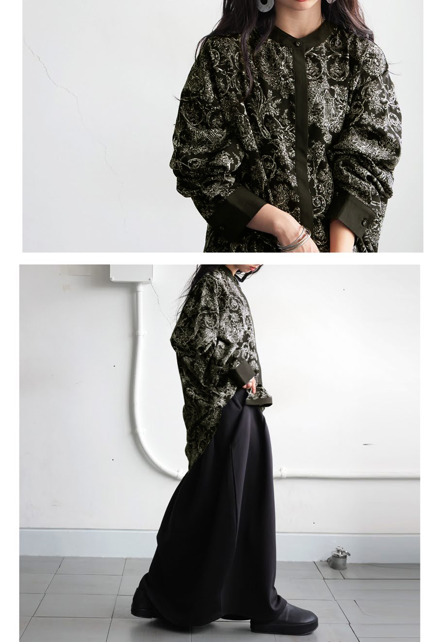 襟元(バンドカラー)・袖口・前立ては無地ブラックで切り替え、全体を引き締める大人のバイカラーデザイン。