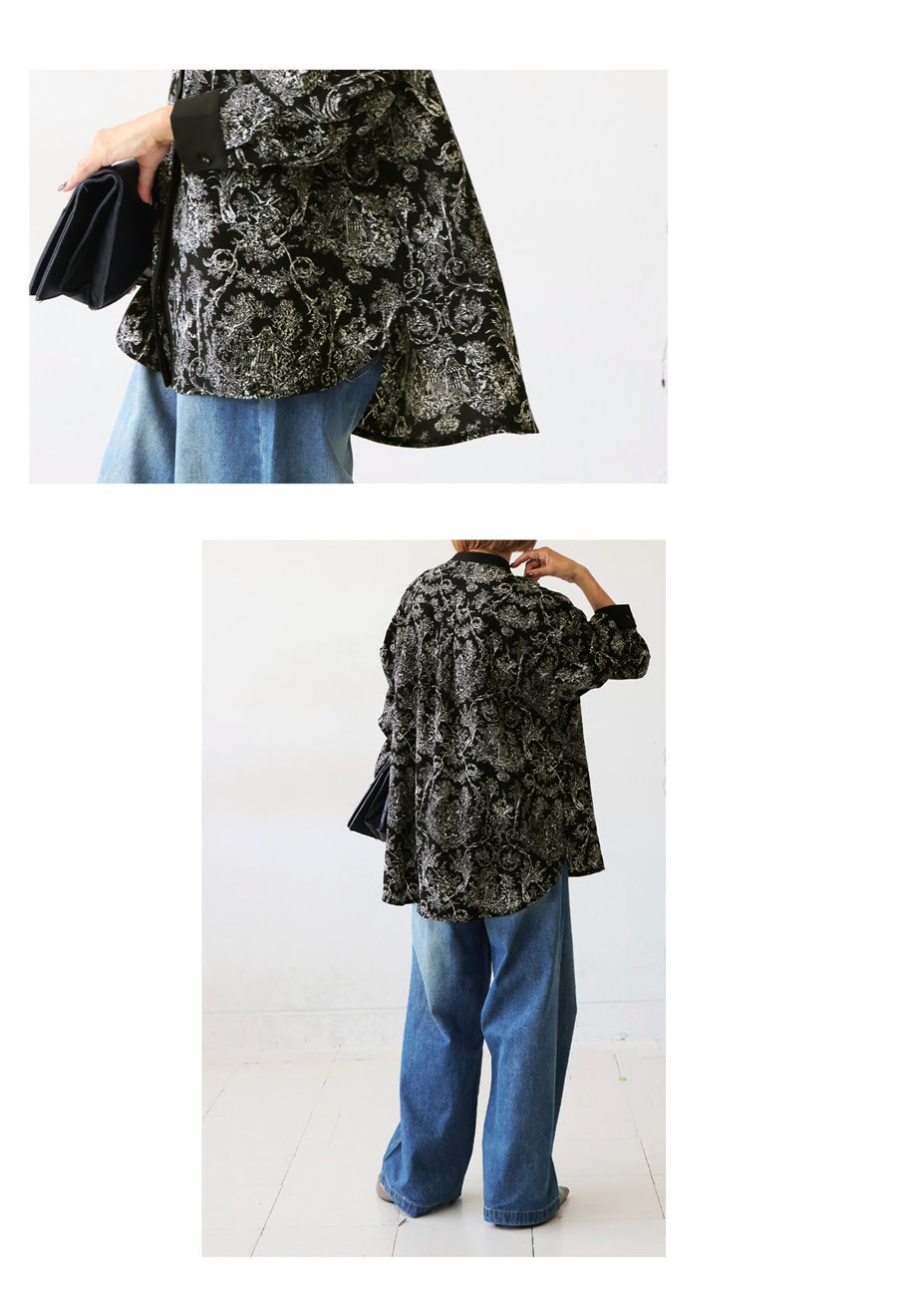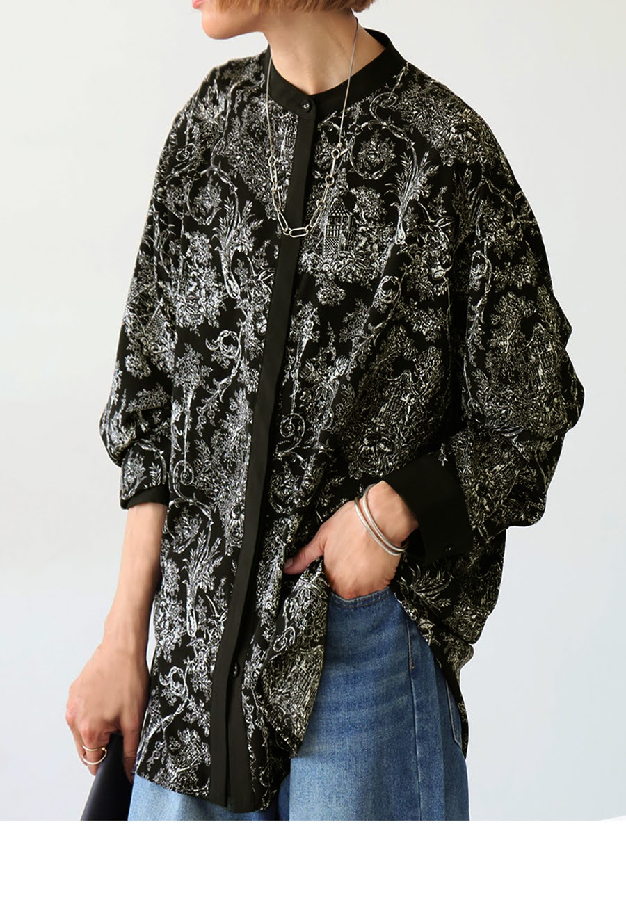 ロココ調の絵画のような繊細な柄が、着こなしに奥行きと高級感を添えてくれます。
