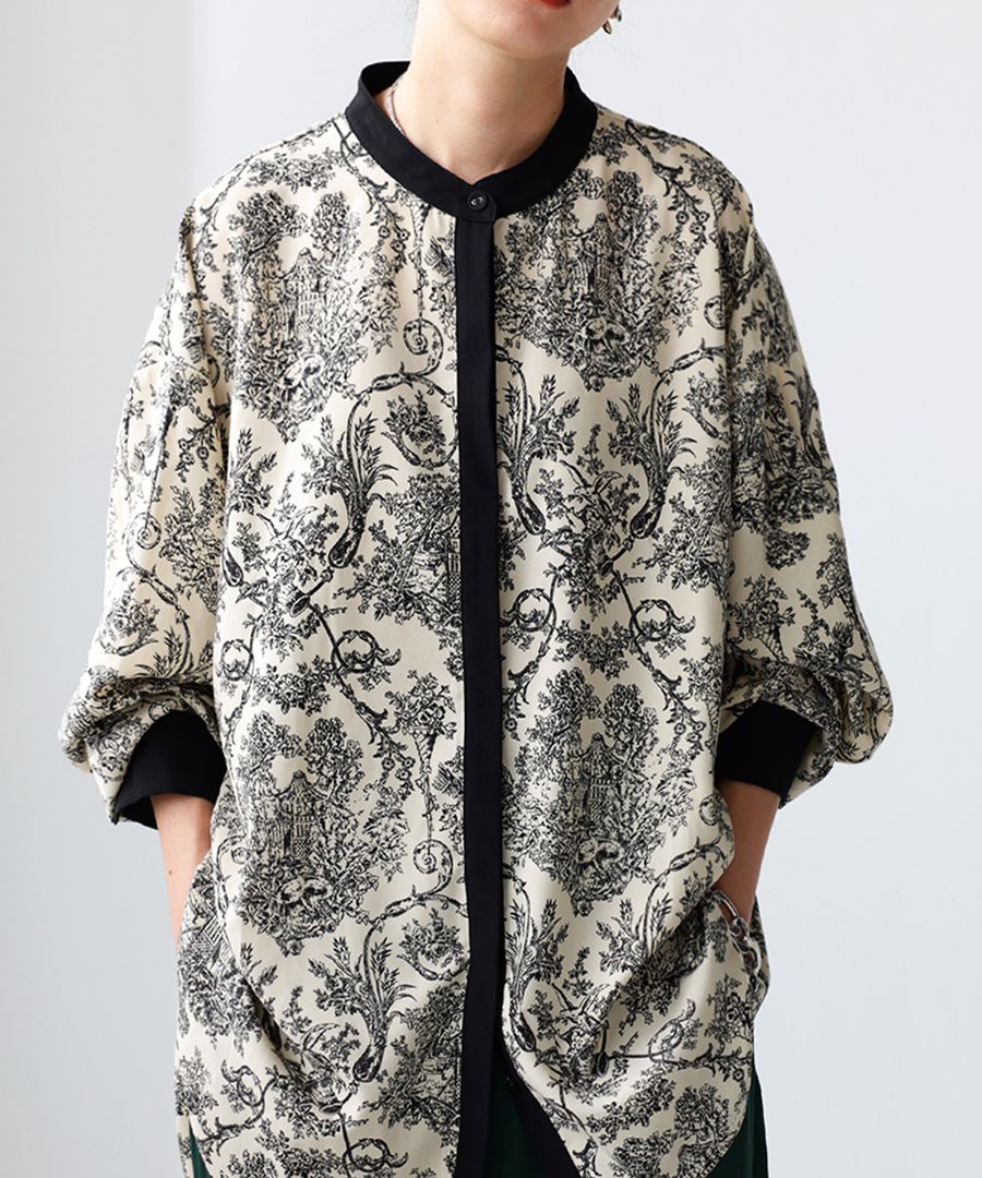 トワルドジュイ柄 シャツ レディース 長袖 バンドカラー・(100)メール便可