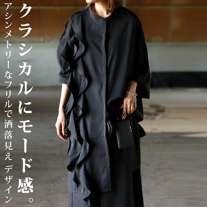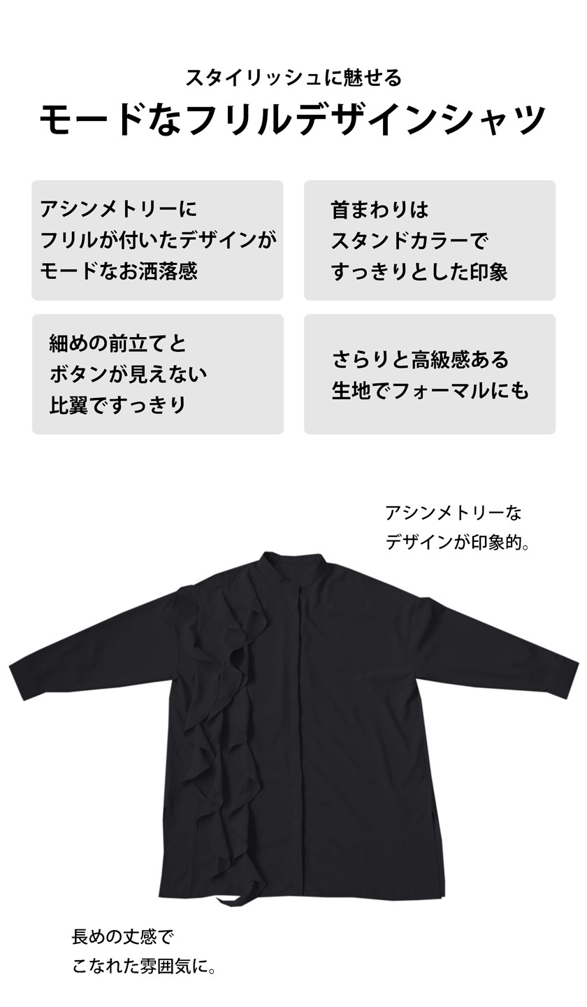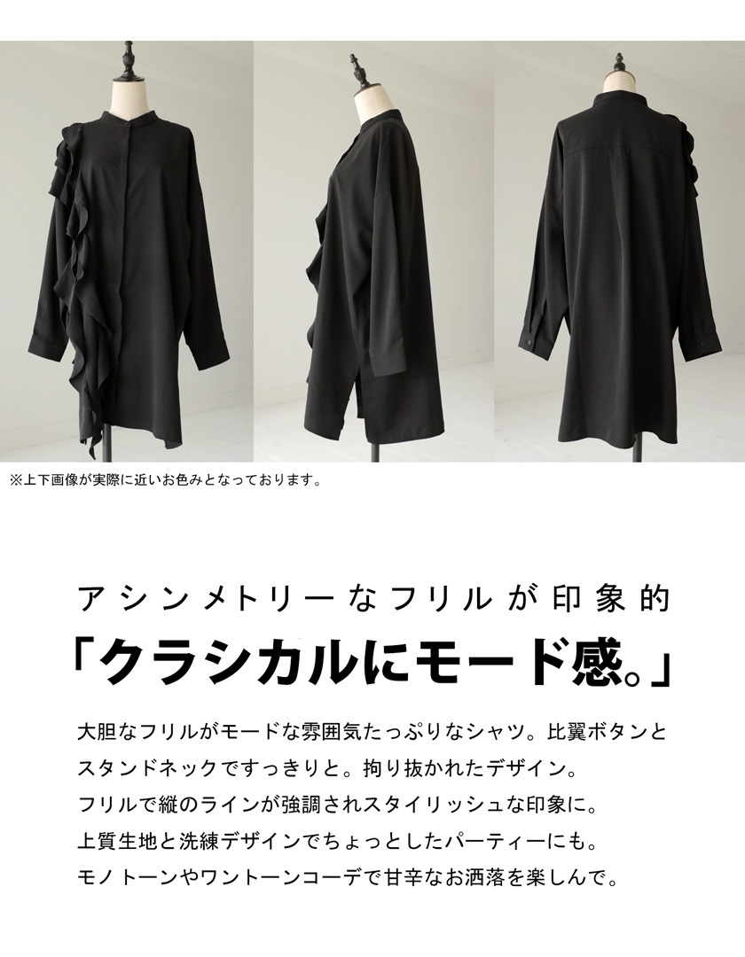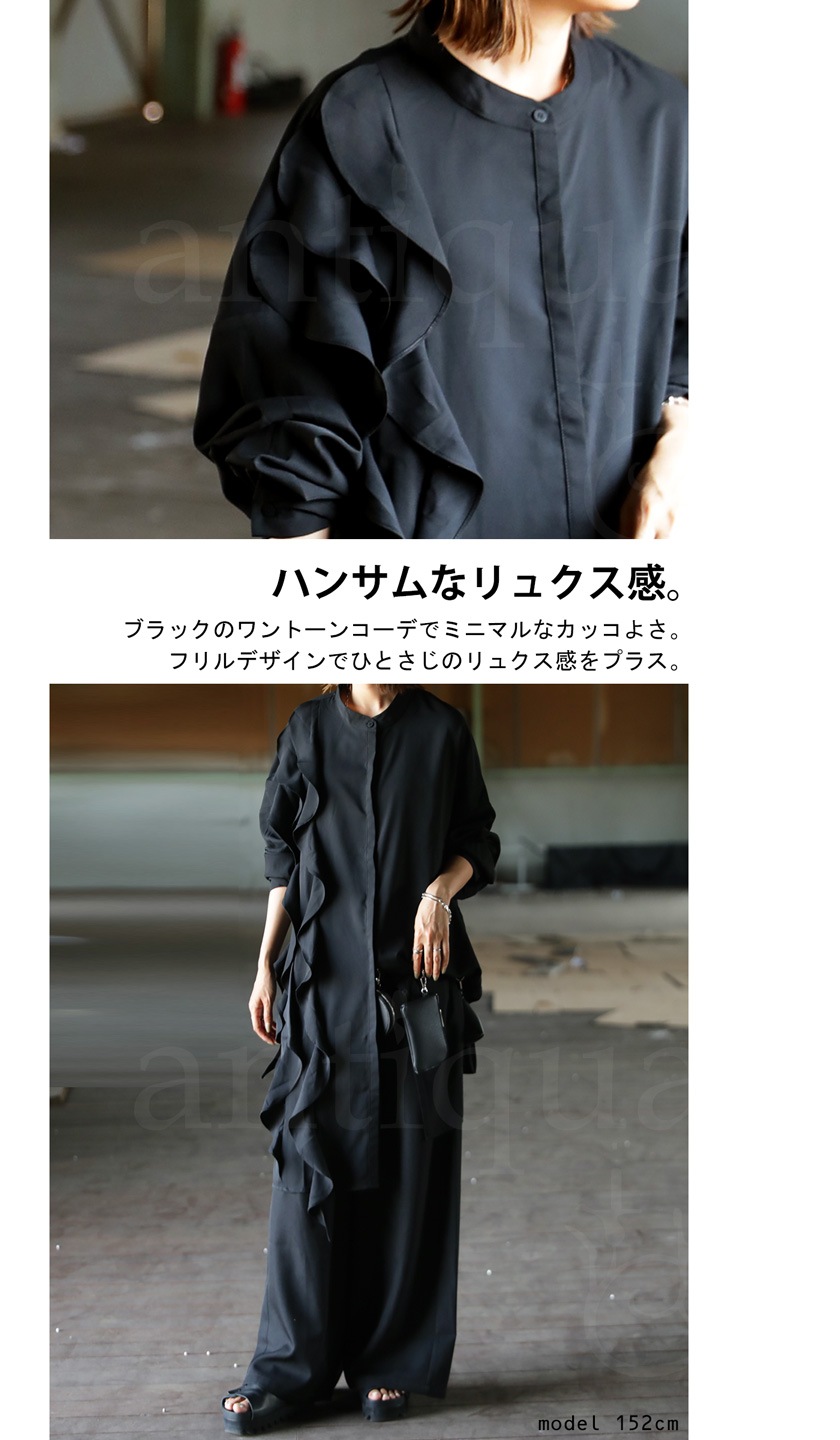 【検索ワード】フリルデザインシャツ シャツ レディース トップス 長袖 無地 フリル アシンメトリー アシメ スタンドカラー バンドカラー ゆったり きれいめ 上品 ロング ブラウス ロングシャツ スリット 比翼ボタン モード クラシカル とろみ生地 落ち感 高級感 フォーマル 結婚式 二次会 パーティー オケージョン オーバーサイズ 大きいサイズ antiqua アンティカ 大人 おしゃれ 10代 20代 30代 40代 50代 60代 春 夏 秋 冬 オールシーズン お洒落 カジュアル かわいい かっこいい あんてぃか