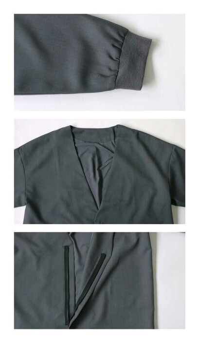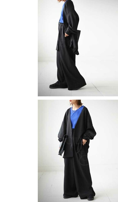 モード感も醸しだすシャープな雰囲気ながら、袖の緩急あるシルエットやノーカラー、ゆったり身幅が着回し力をあげて。