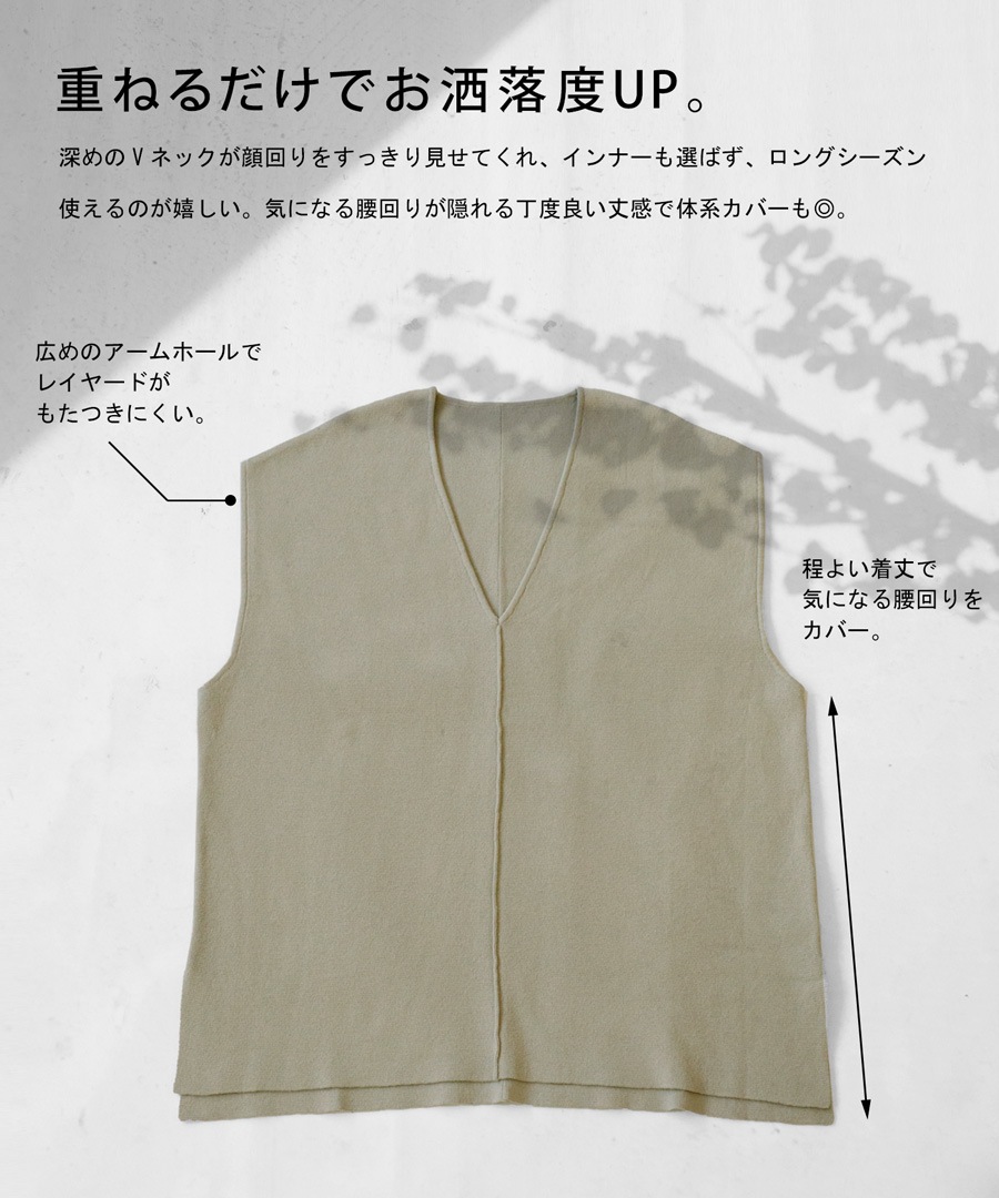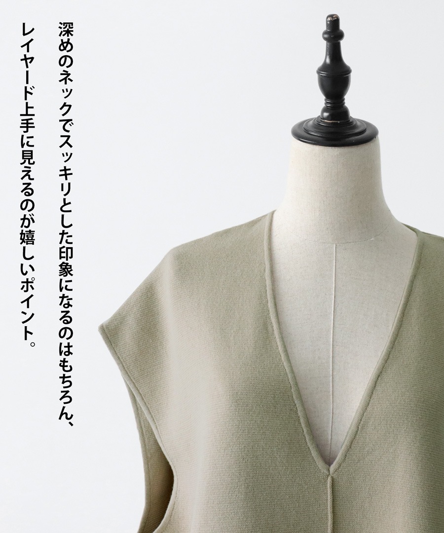 シンプルだからどんなコーデとも相性が良く、深Vネックと縦のラインがスッキリとした印象に。