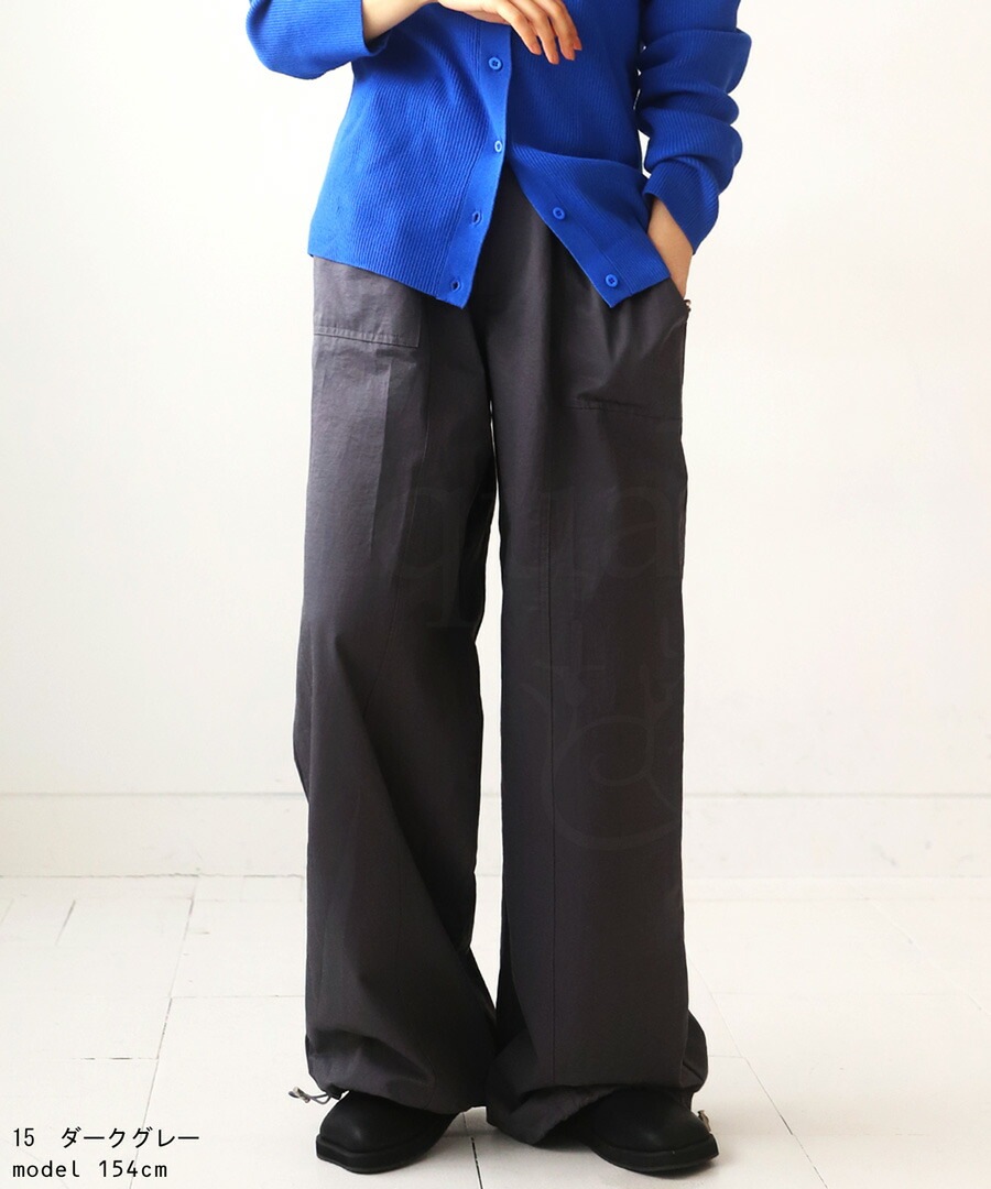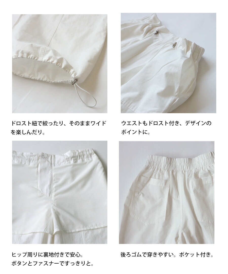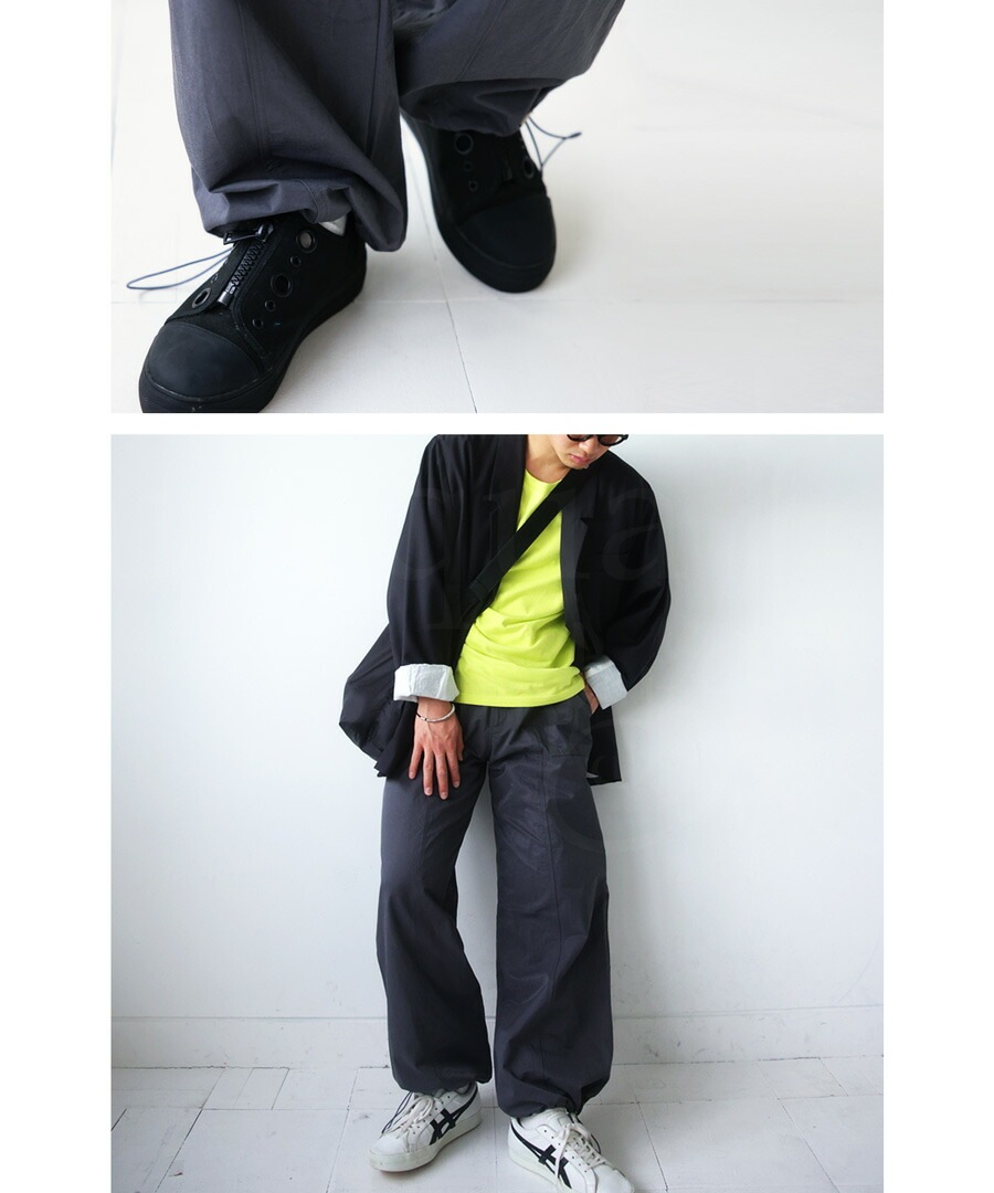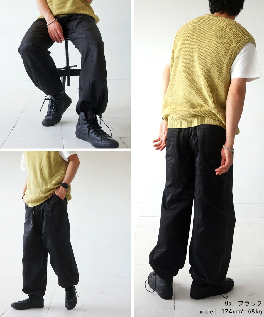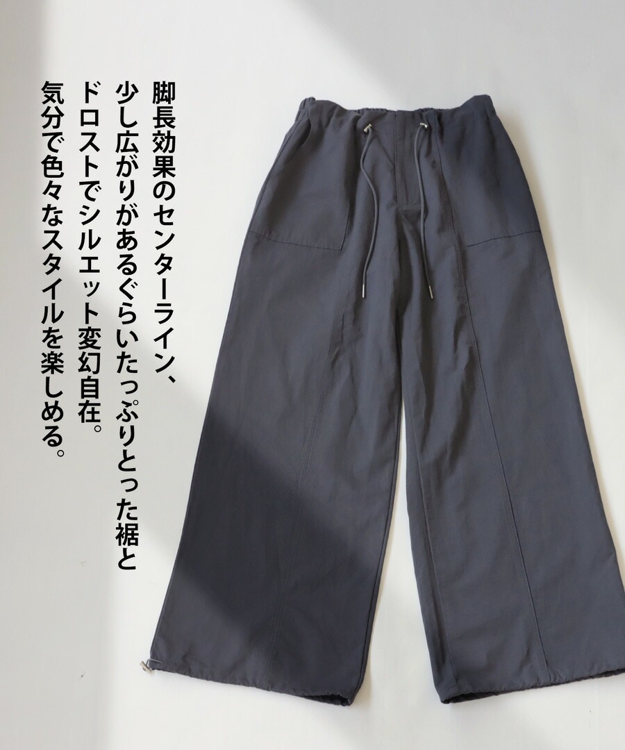 そのまま穿けばワイドパンツ、裾についたコードでドロストパンツと変幻自在に穿けます。