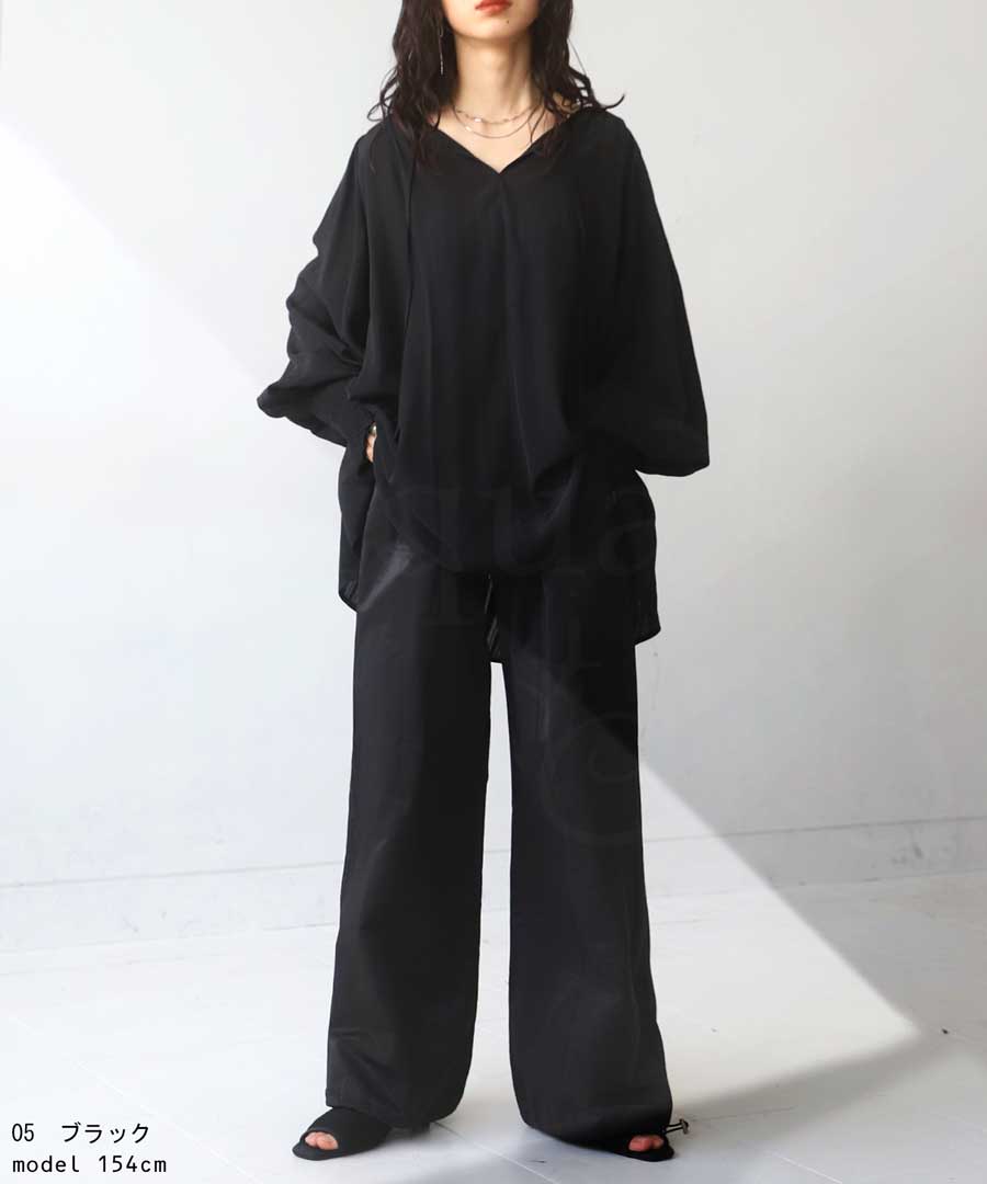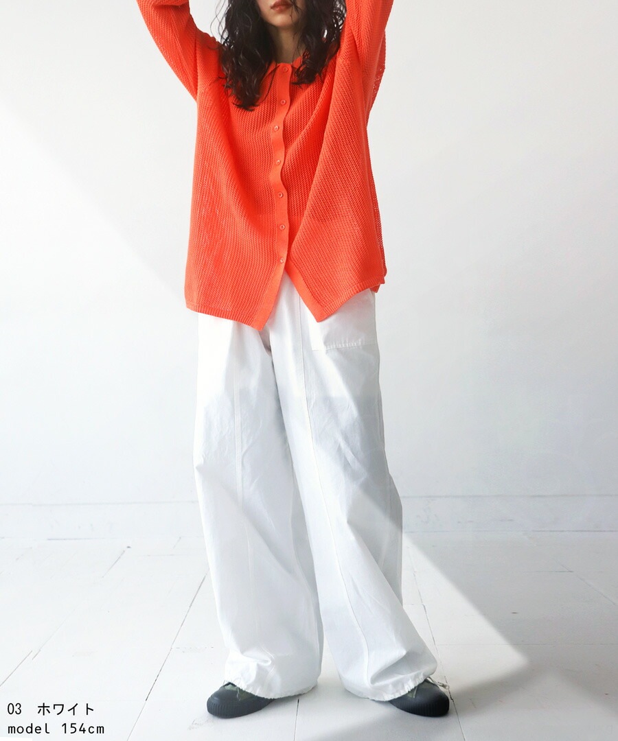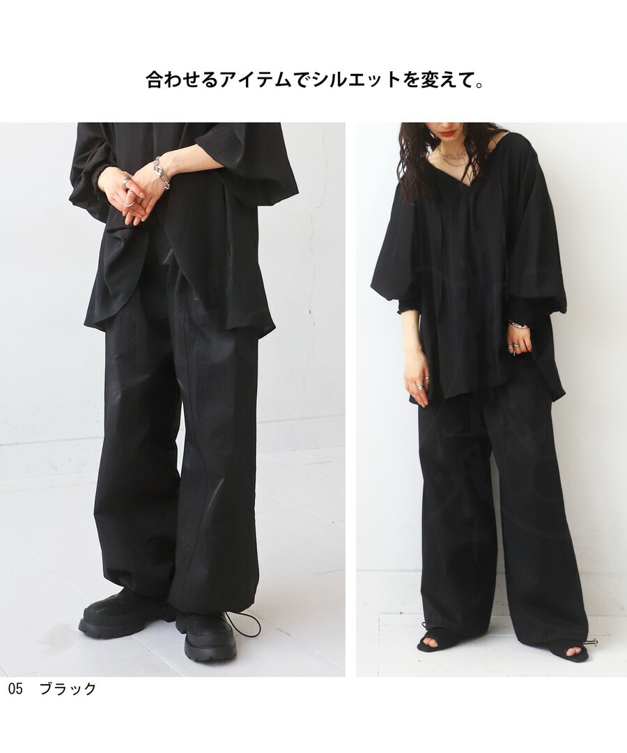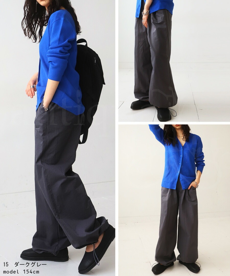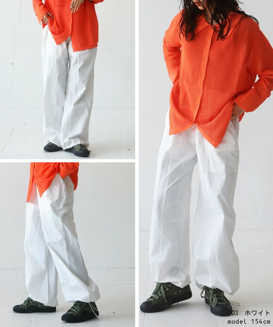 そのまま穿けばワイドパンツ、裾についたコードでドロストパンツと変幻自在に穿けます。