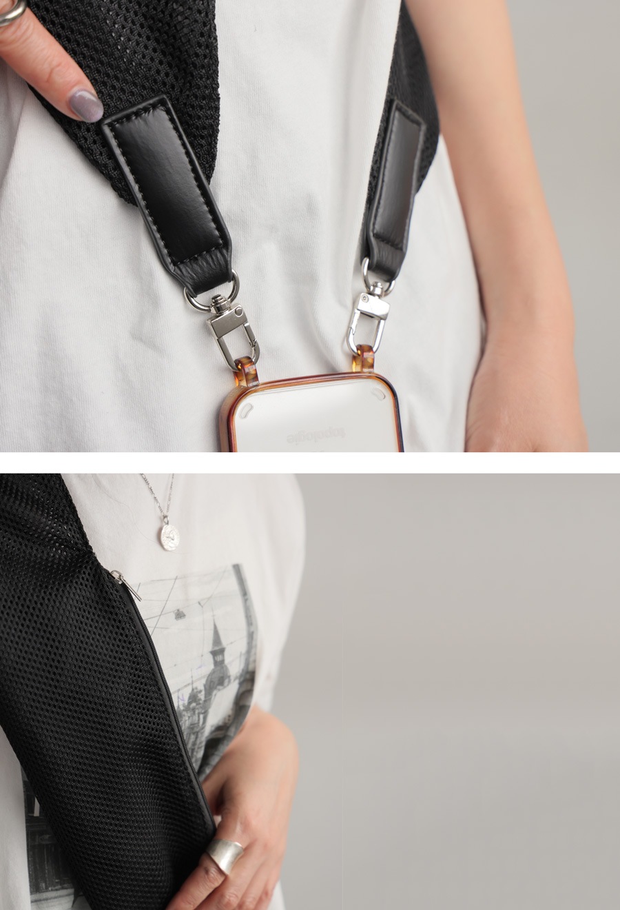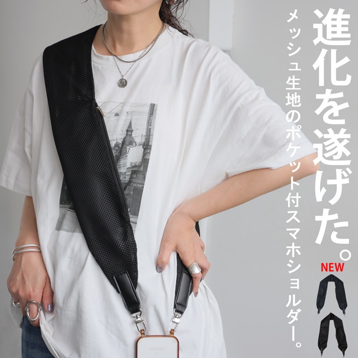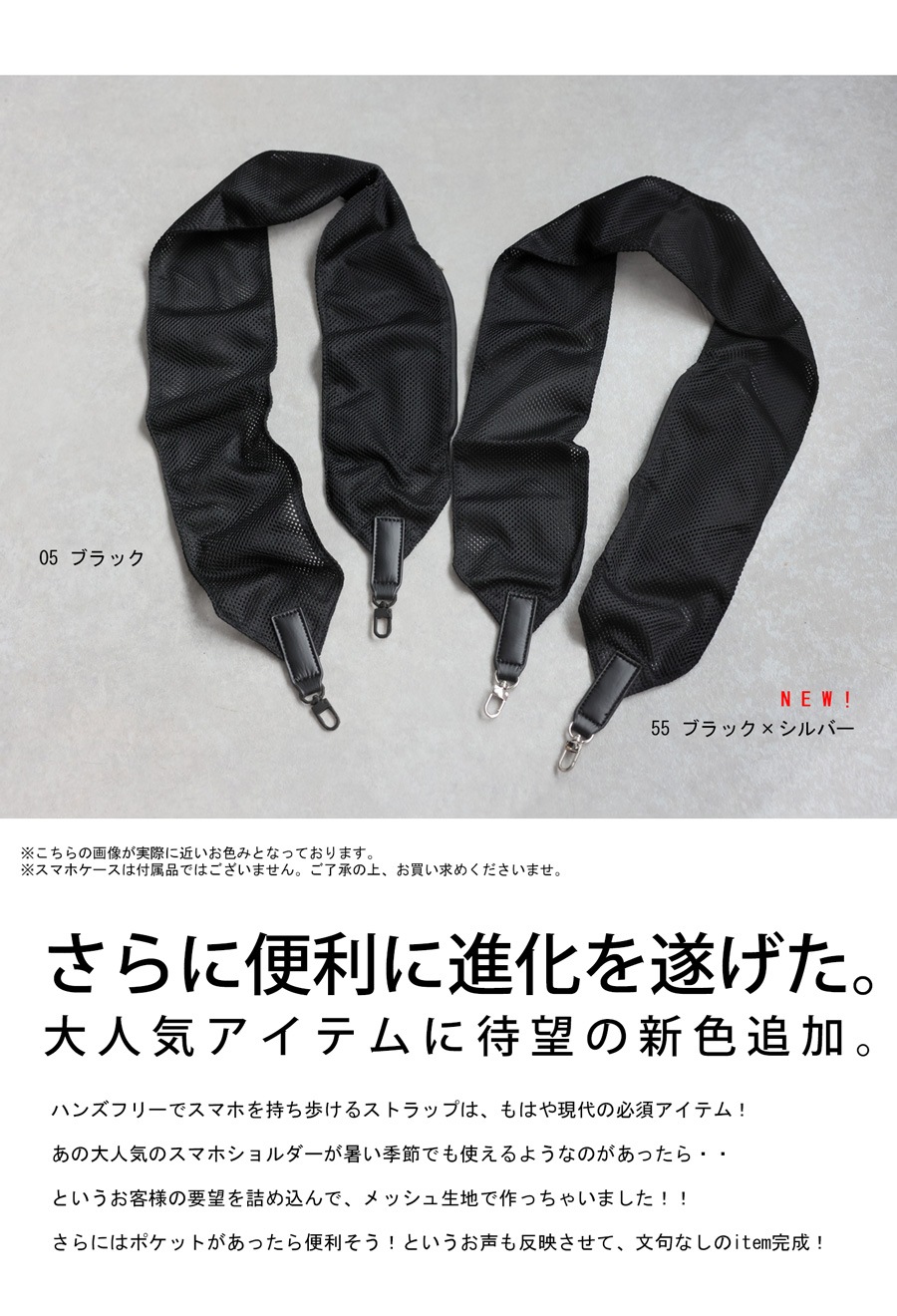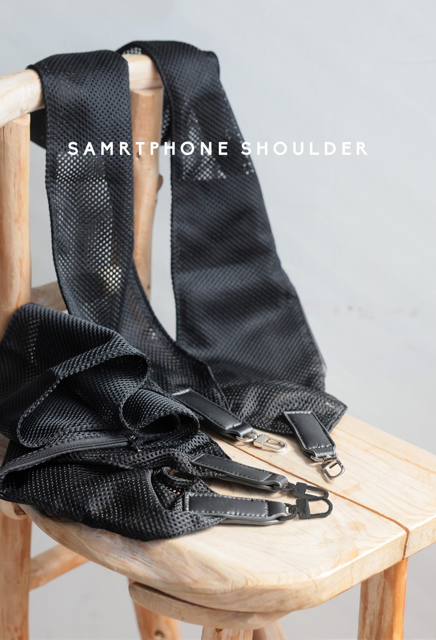 暑い季節にうれしい、涼しげなメッシュ素材で仕立てたスマホショルダーです。