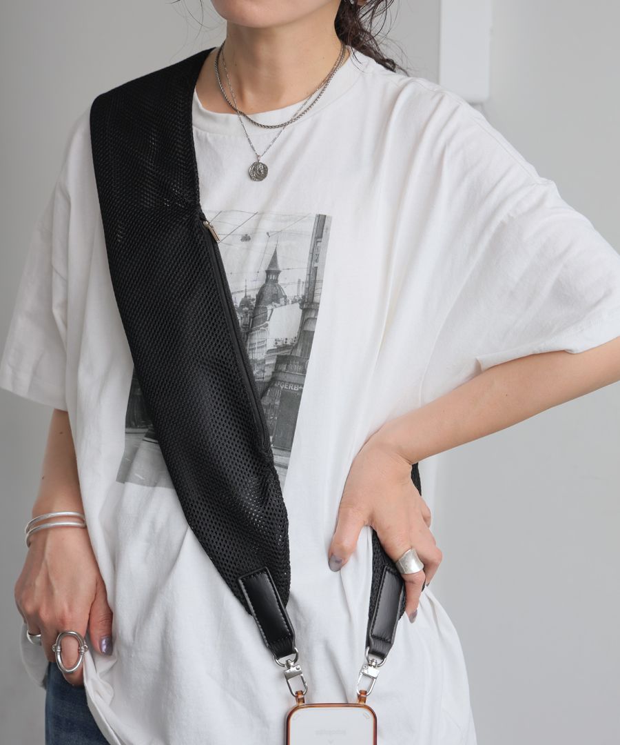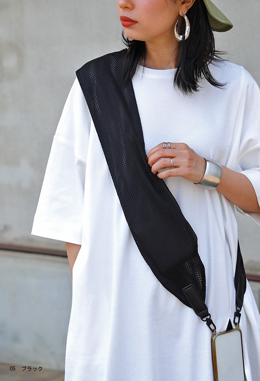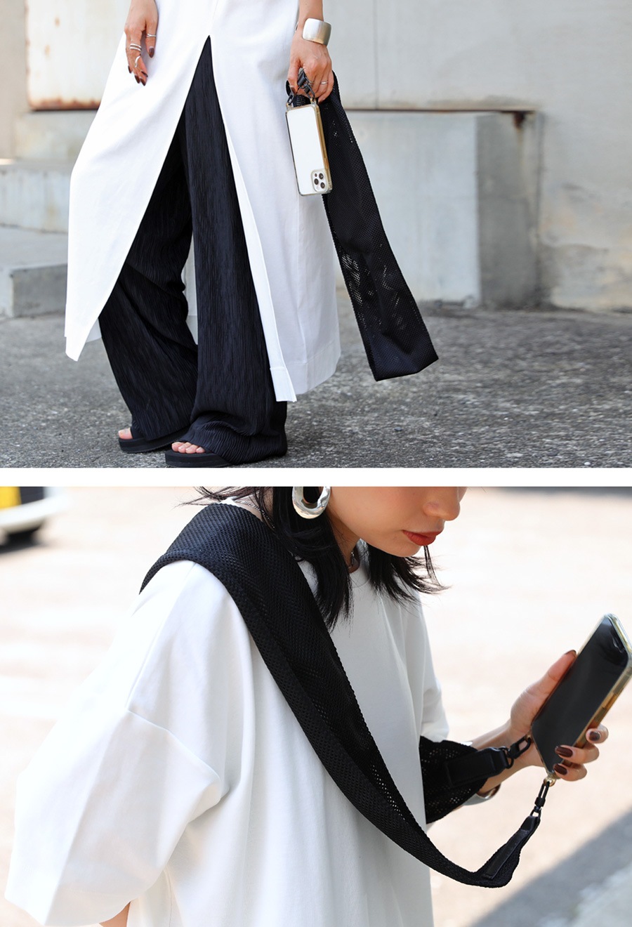 暑い季節にうれしい、涼しげなメッシュ素材で仕立てたスマホショルダーです。