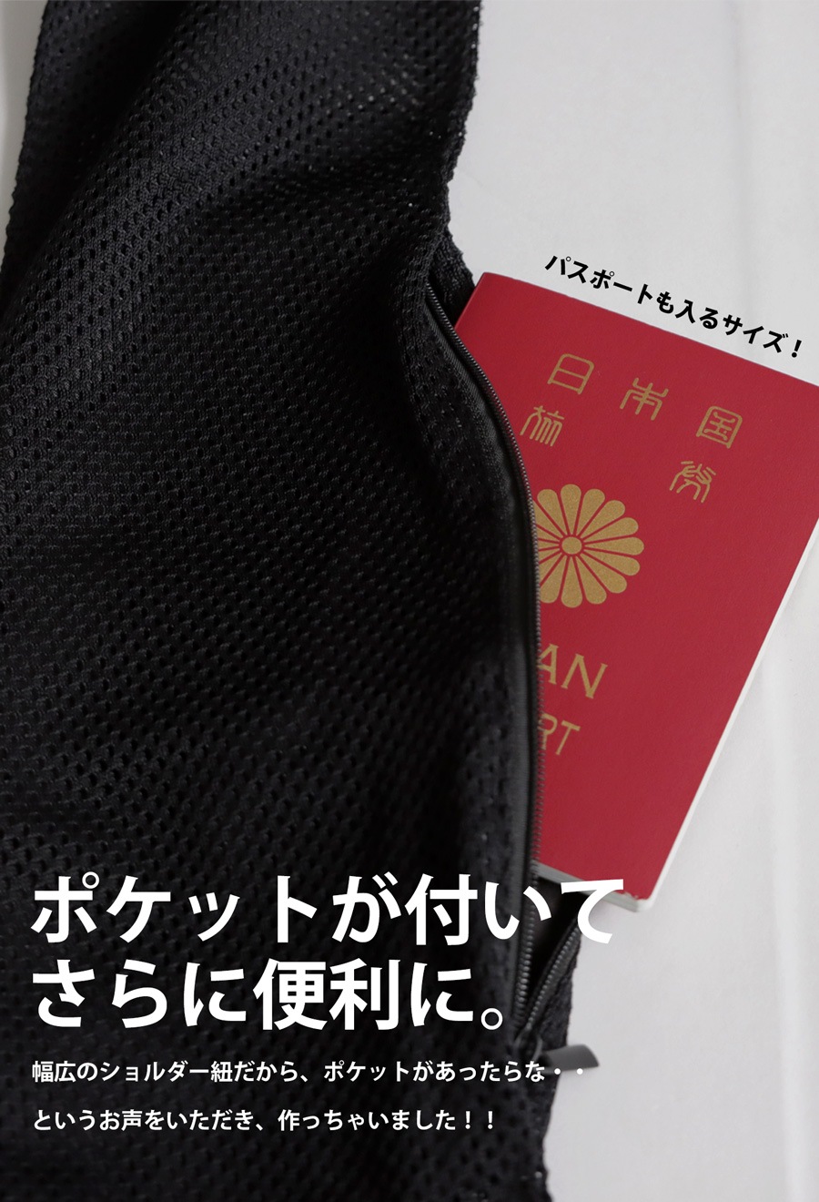 大きめのメッシュポケット付きで、パスポートや小物もすっぽり収納可能。