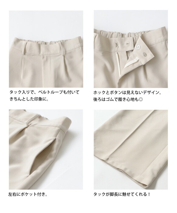 ・タック入りで、ベルトループも付いてきちんとした印象に。