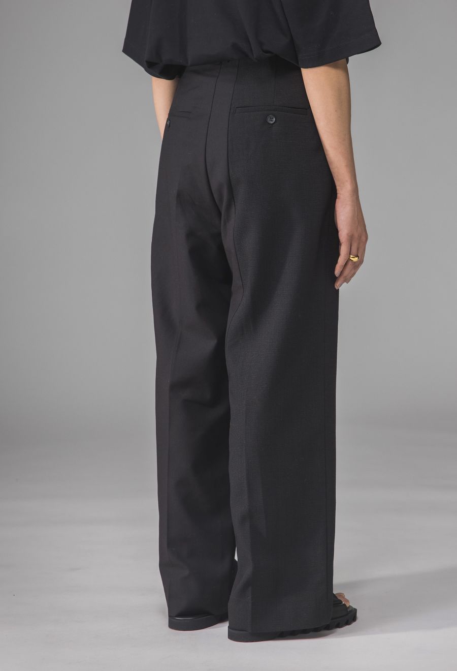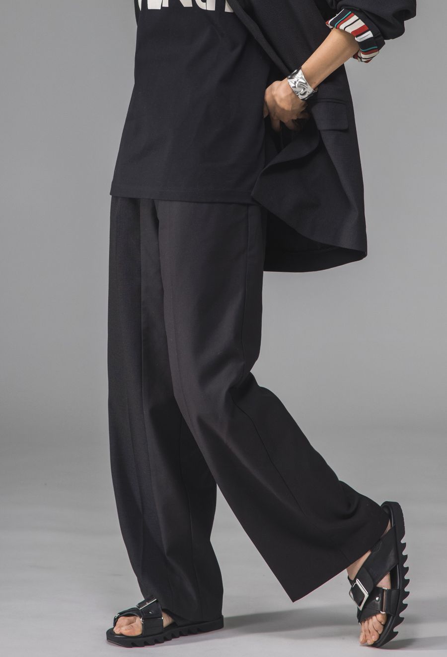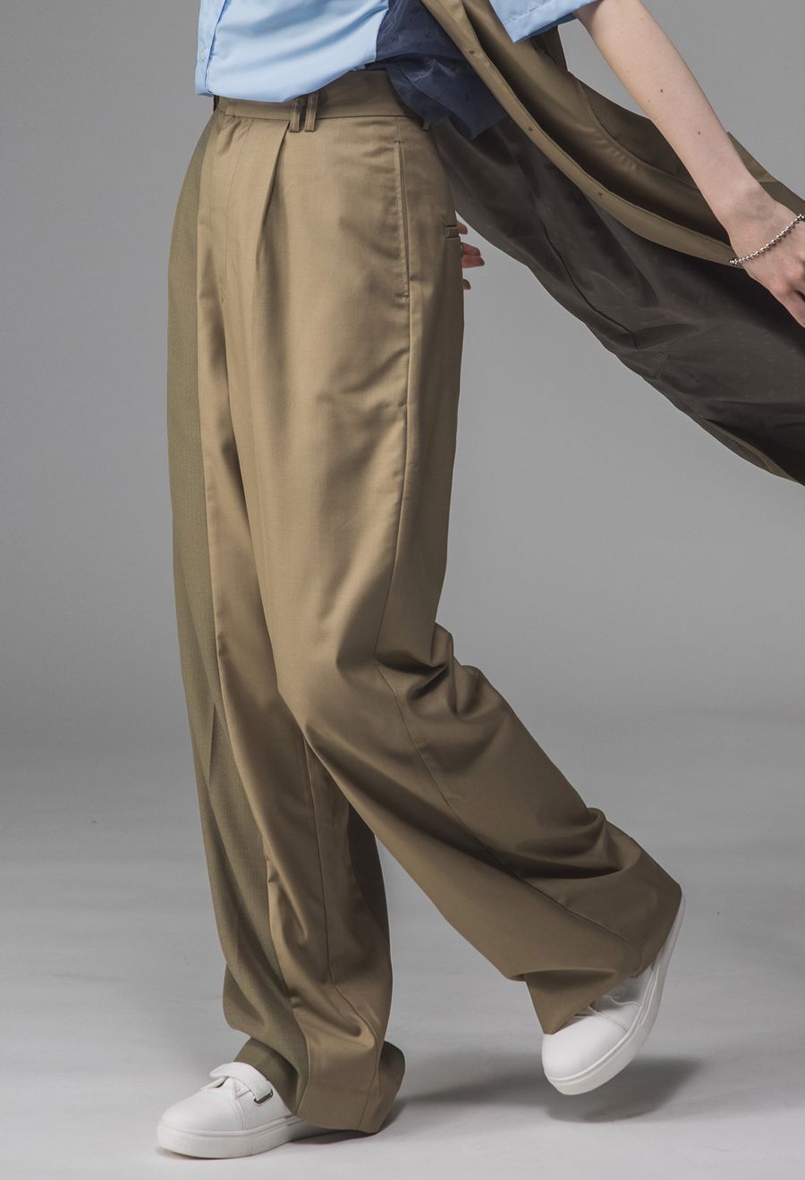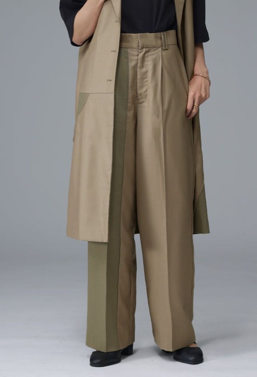 異素材を組み合わせたアシンメトリーな切替が目を惹く、ユニセックス仕様のタックパンツ。