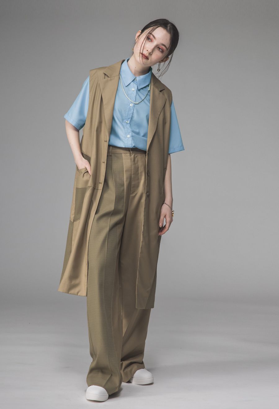 滑らかで光沢のあるポリエステル×レーヨン素材と、リネンライクな切替素材のコントラストが、モードかつモダンな印象に。