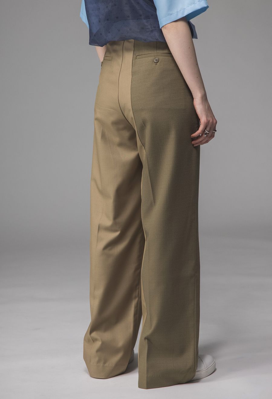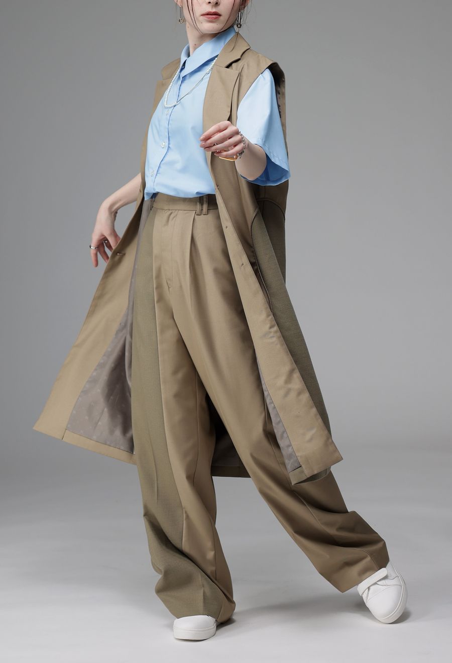 ウエストのタックとセンタープレスが縦のラインを強調し、スタイルアップと体型カバーを同時に叶えます。
