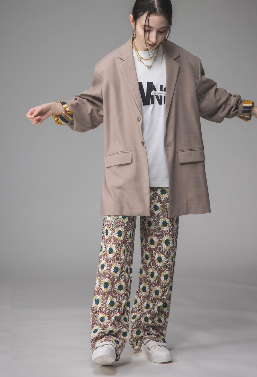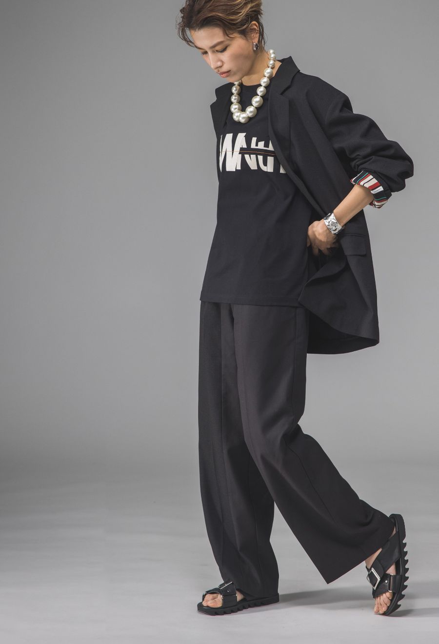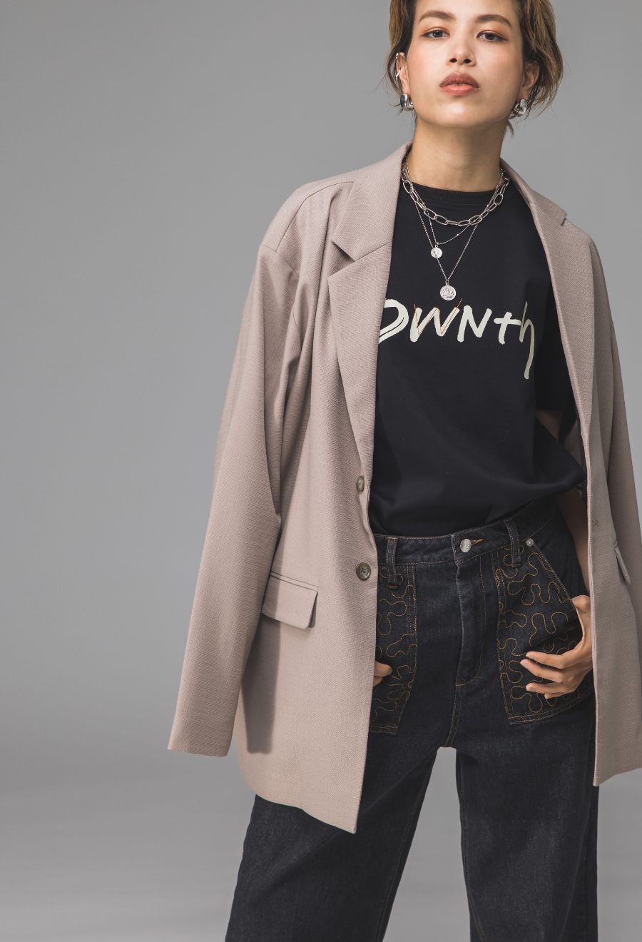 無地ベースのシンプルなデザインに、オーバーサイズのシルエットを掛け合わせ、きれいめにもカジュアルにも対応します。