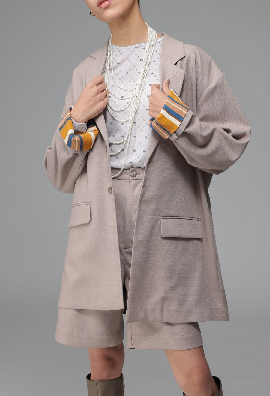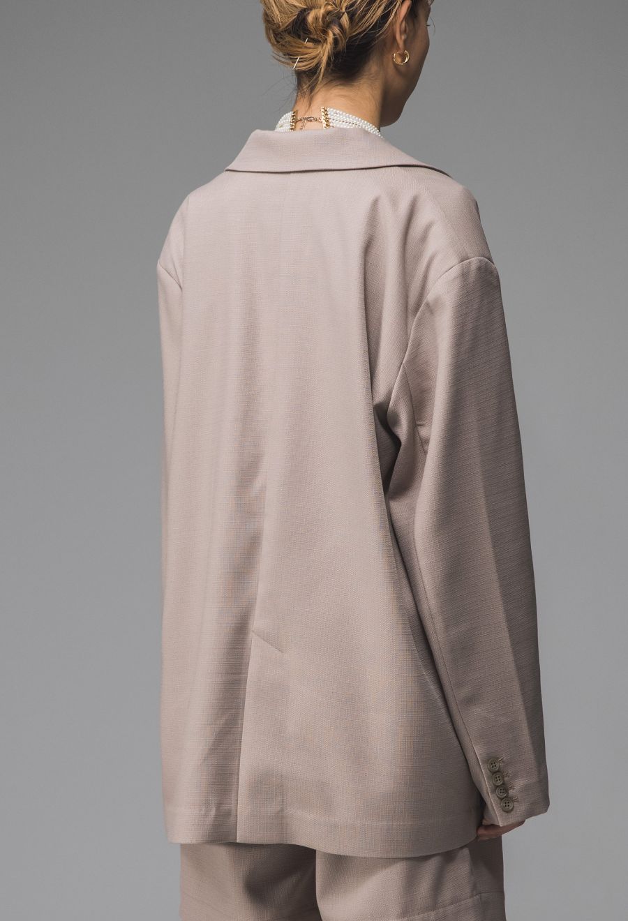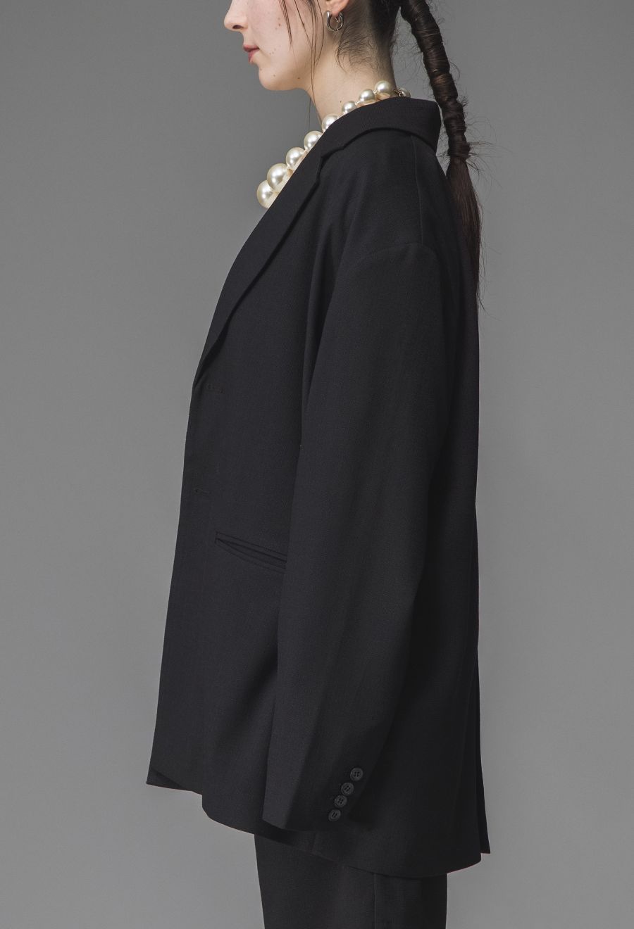 ネックラインは端正なテーラード仕様で、モード感とナチュラルさを併せ持った印象に。