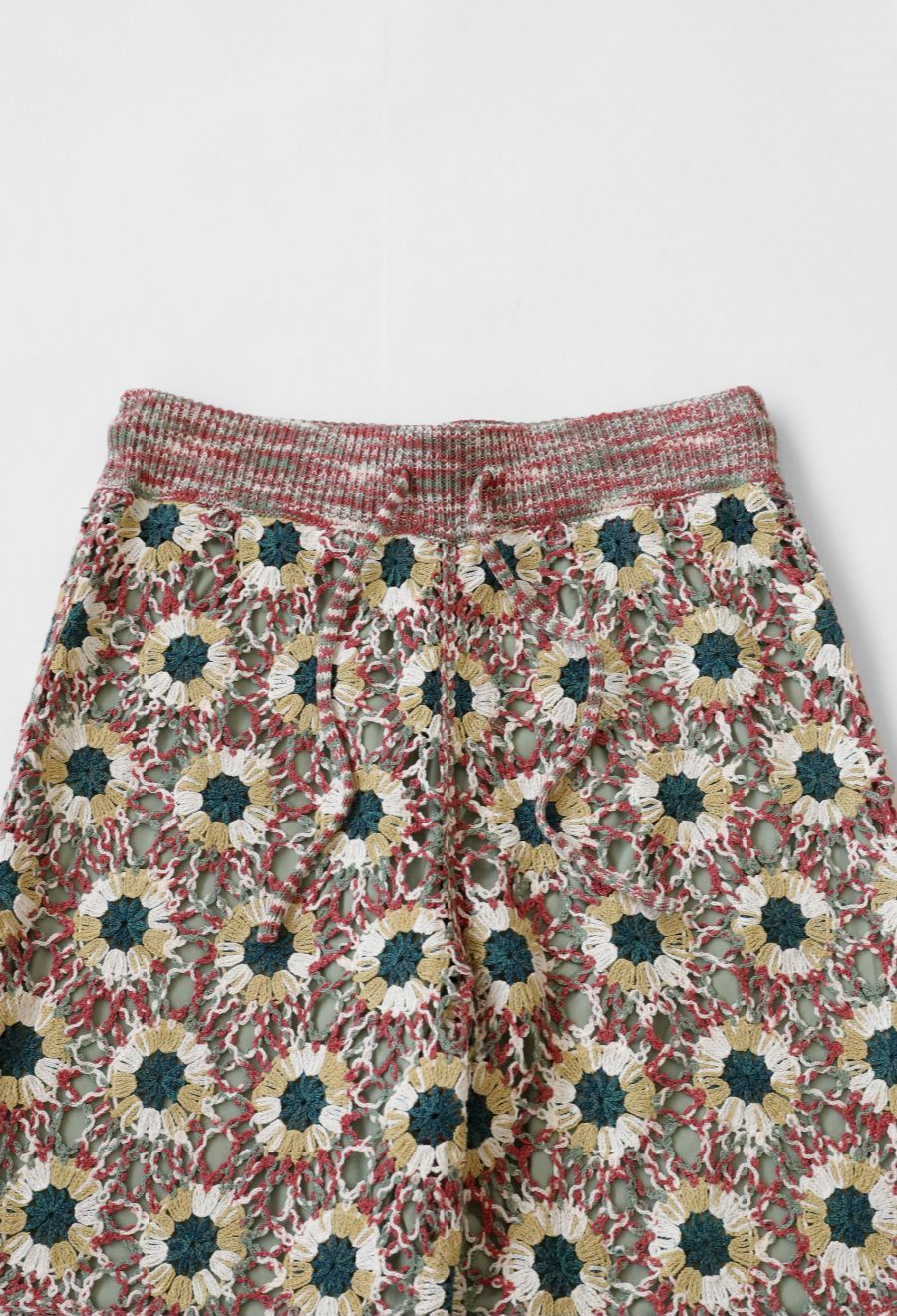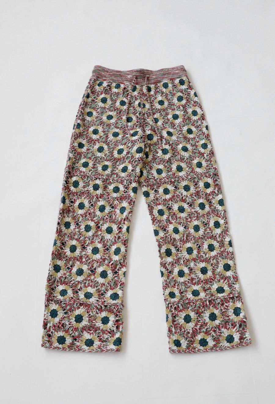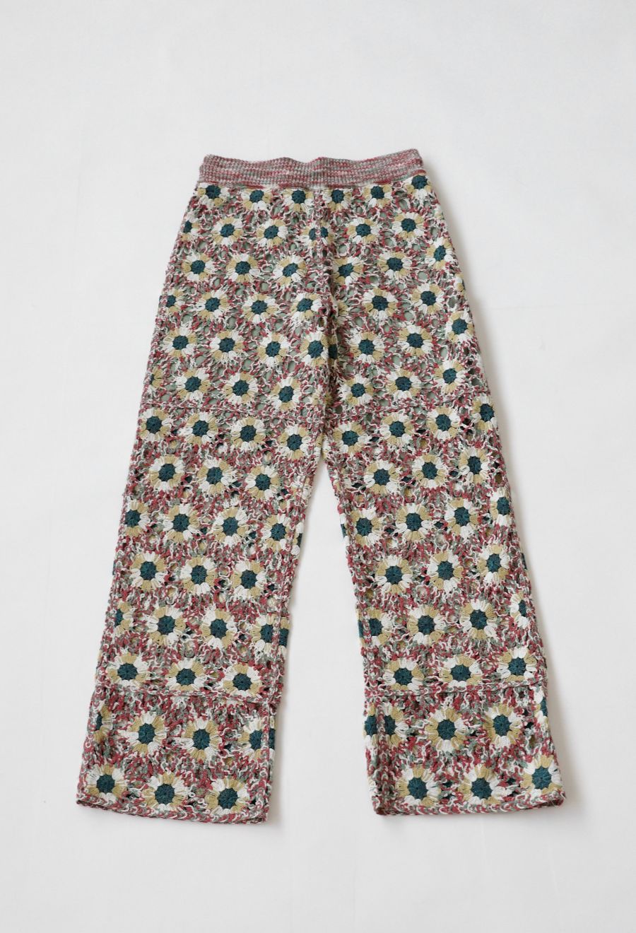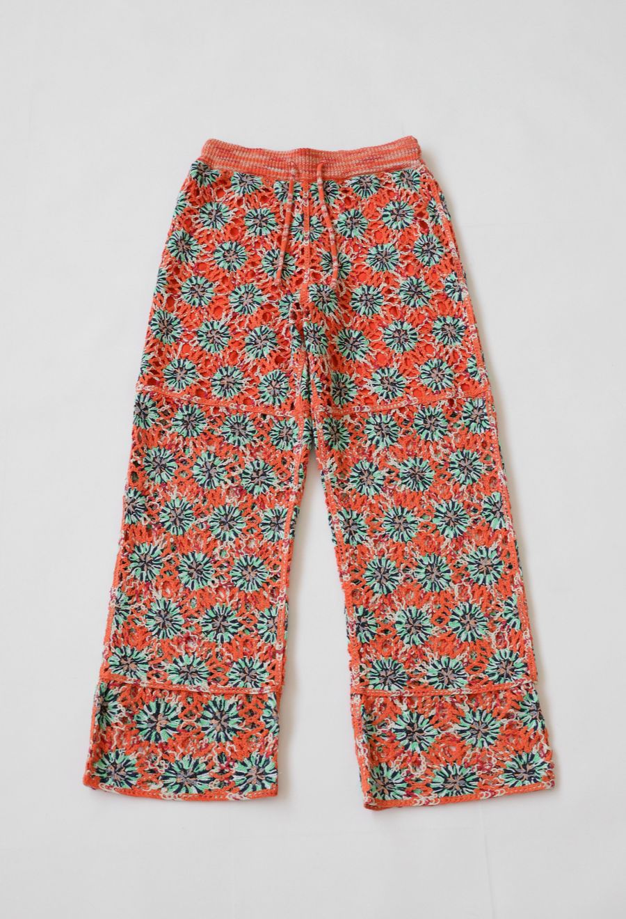 大胆な配色が目を引く、総柄クロシェ編みニットパンツです。