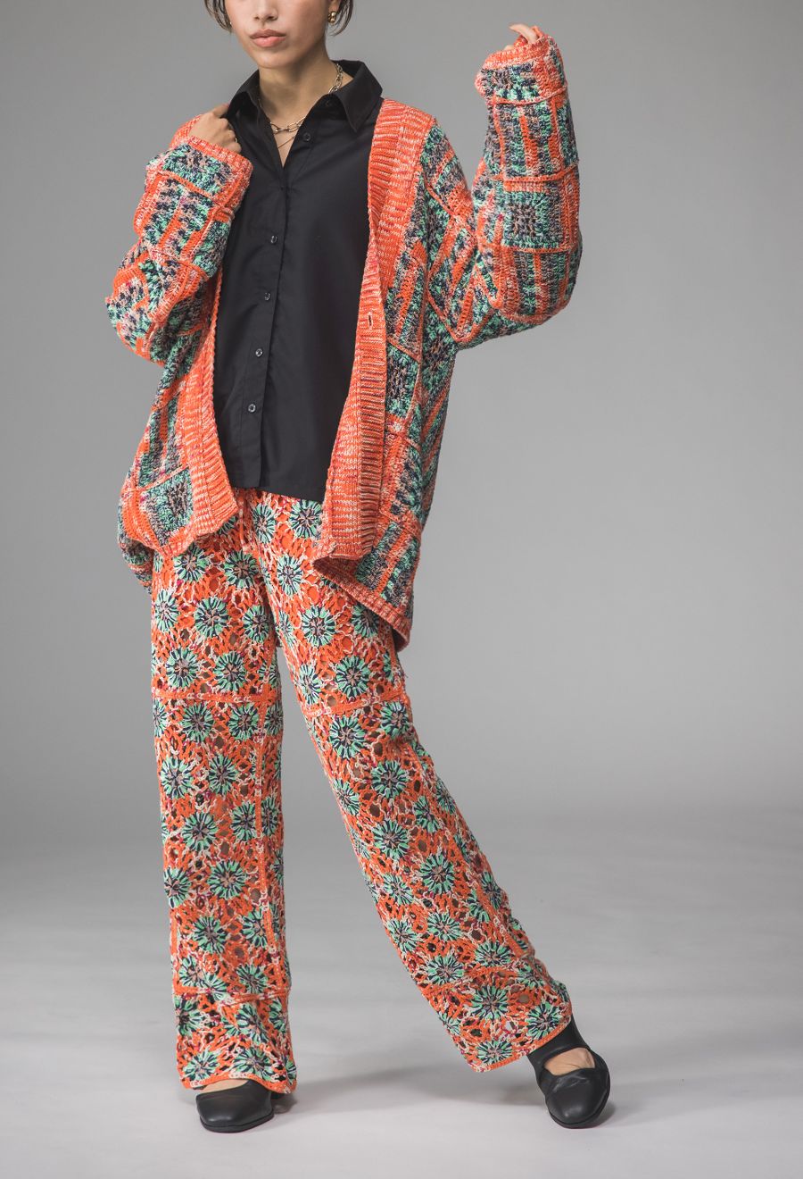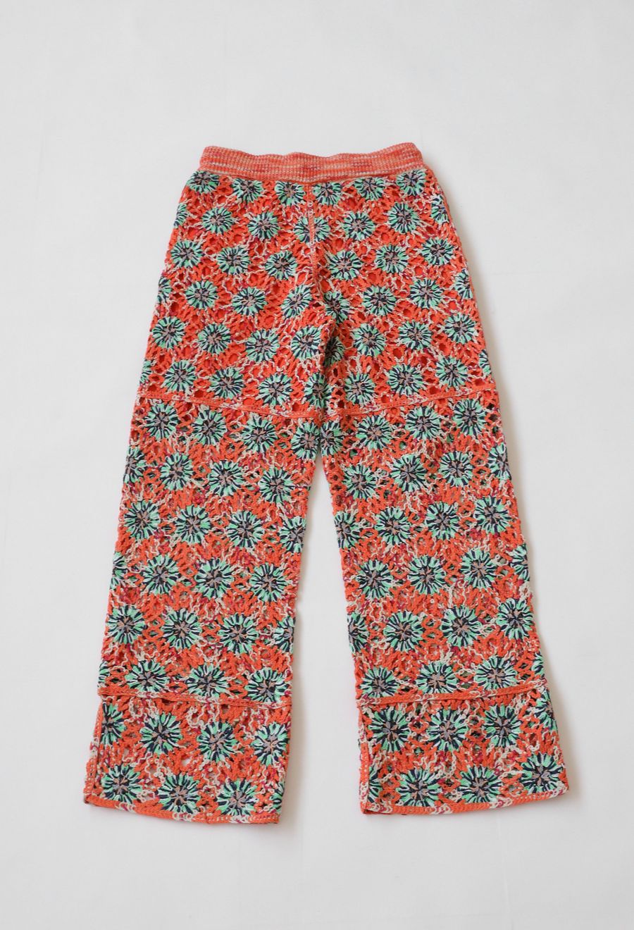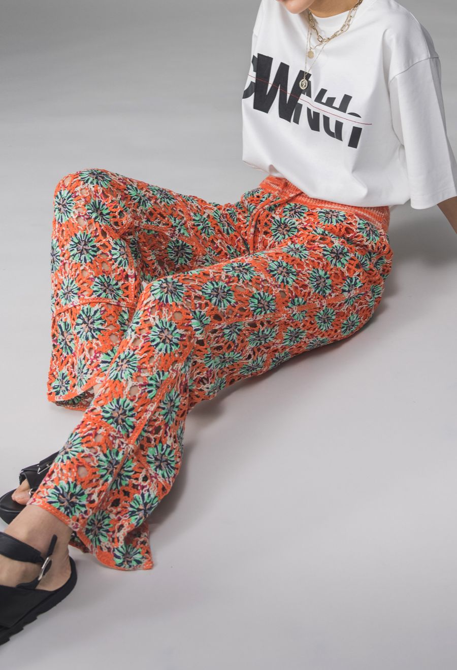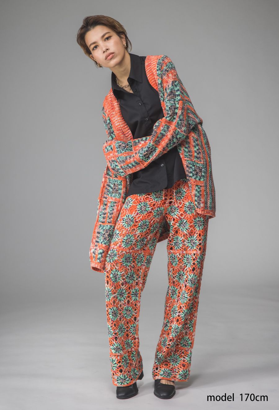 大胆な配色が目を引く、総柄クロシェ編みニットパンツです。