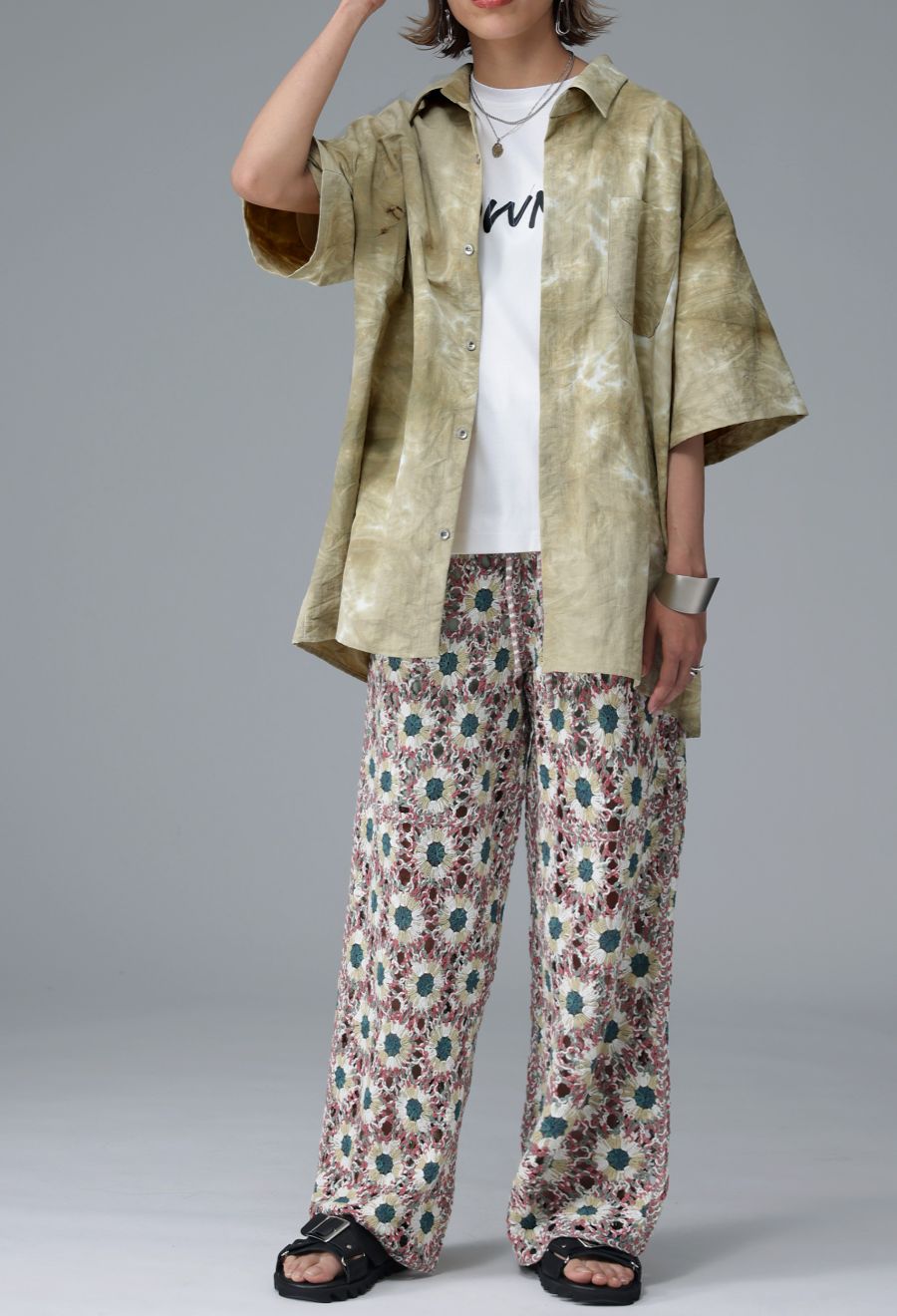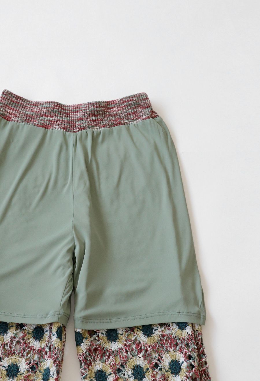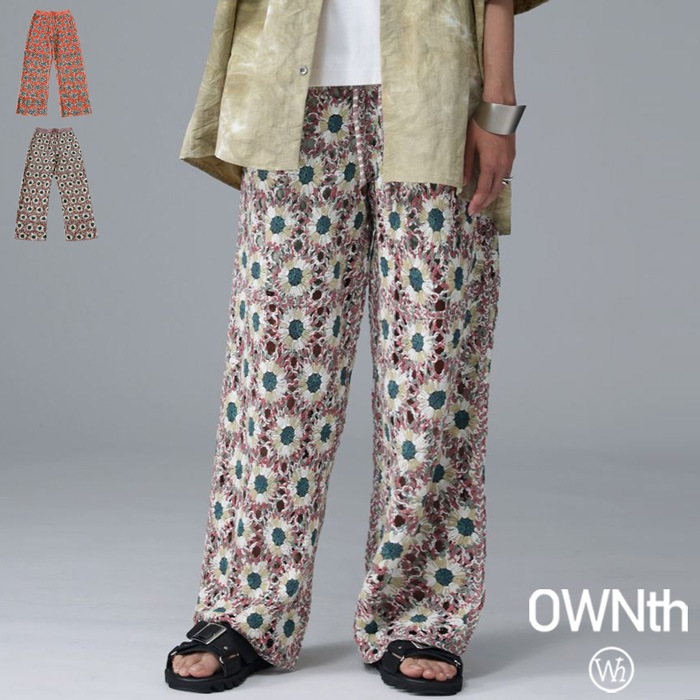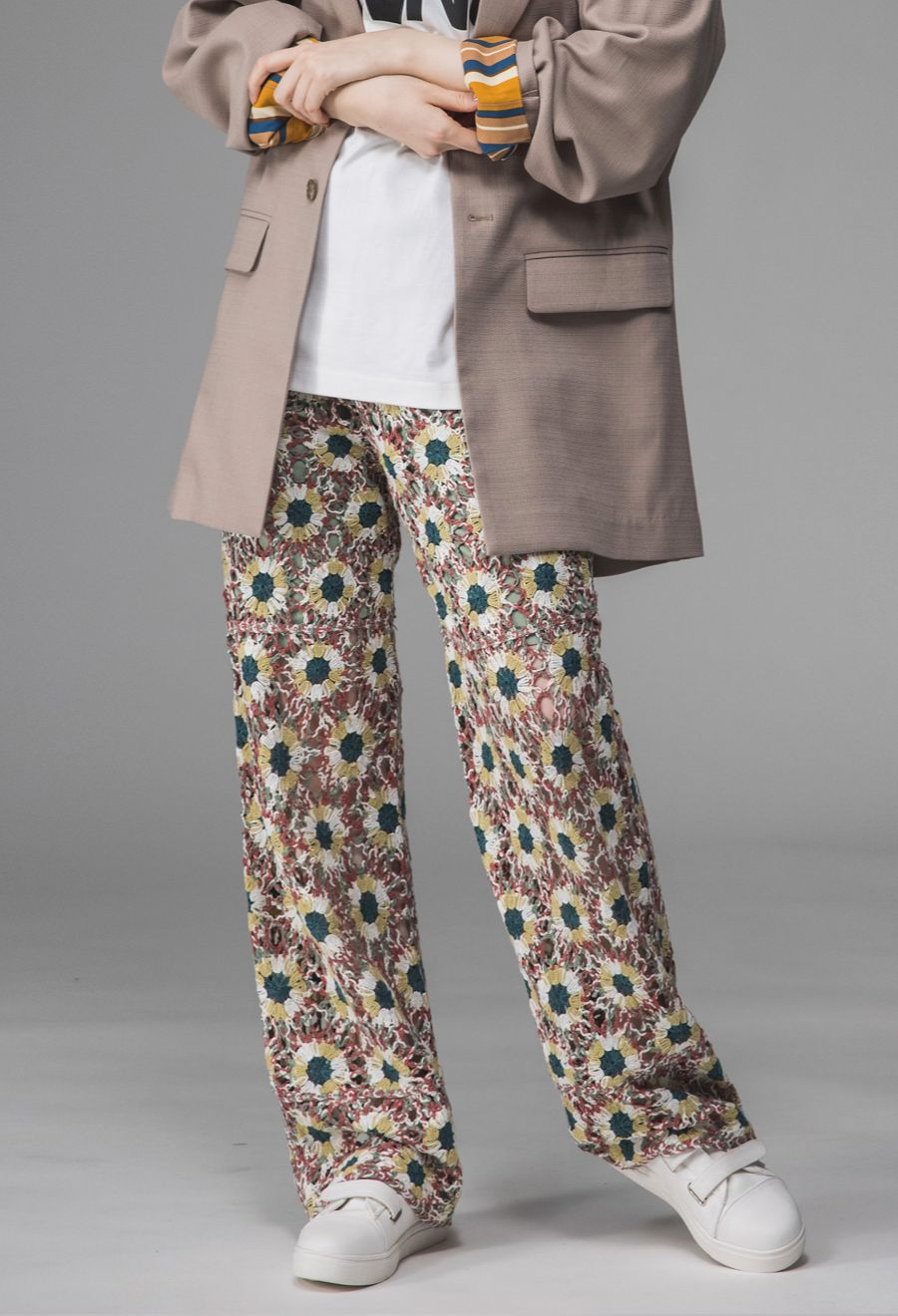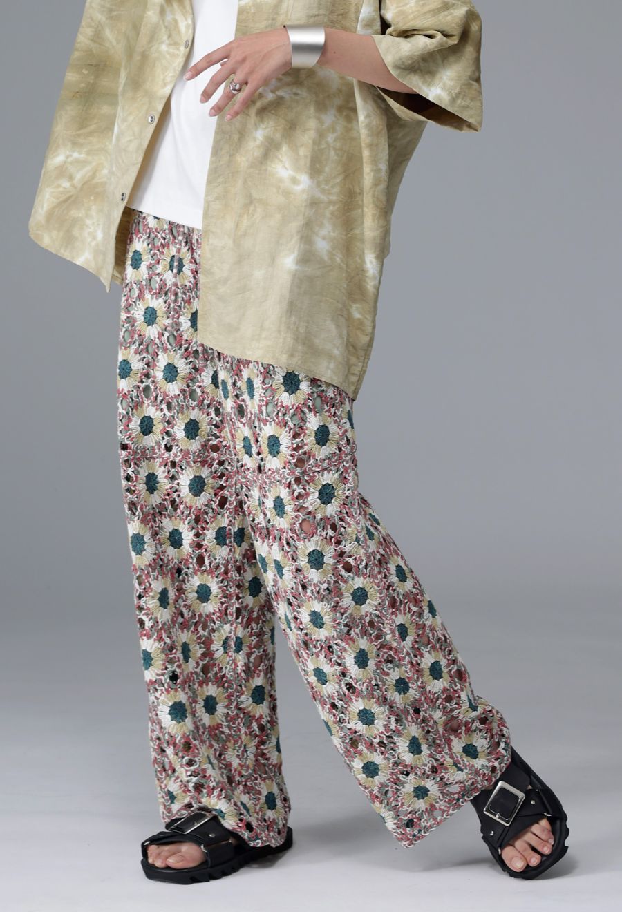 大胆な配色が目を引く、総柄クロシェ編みニットパンツです。