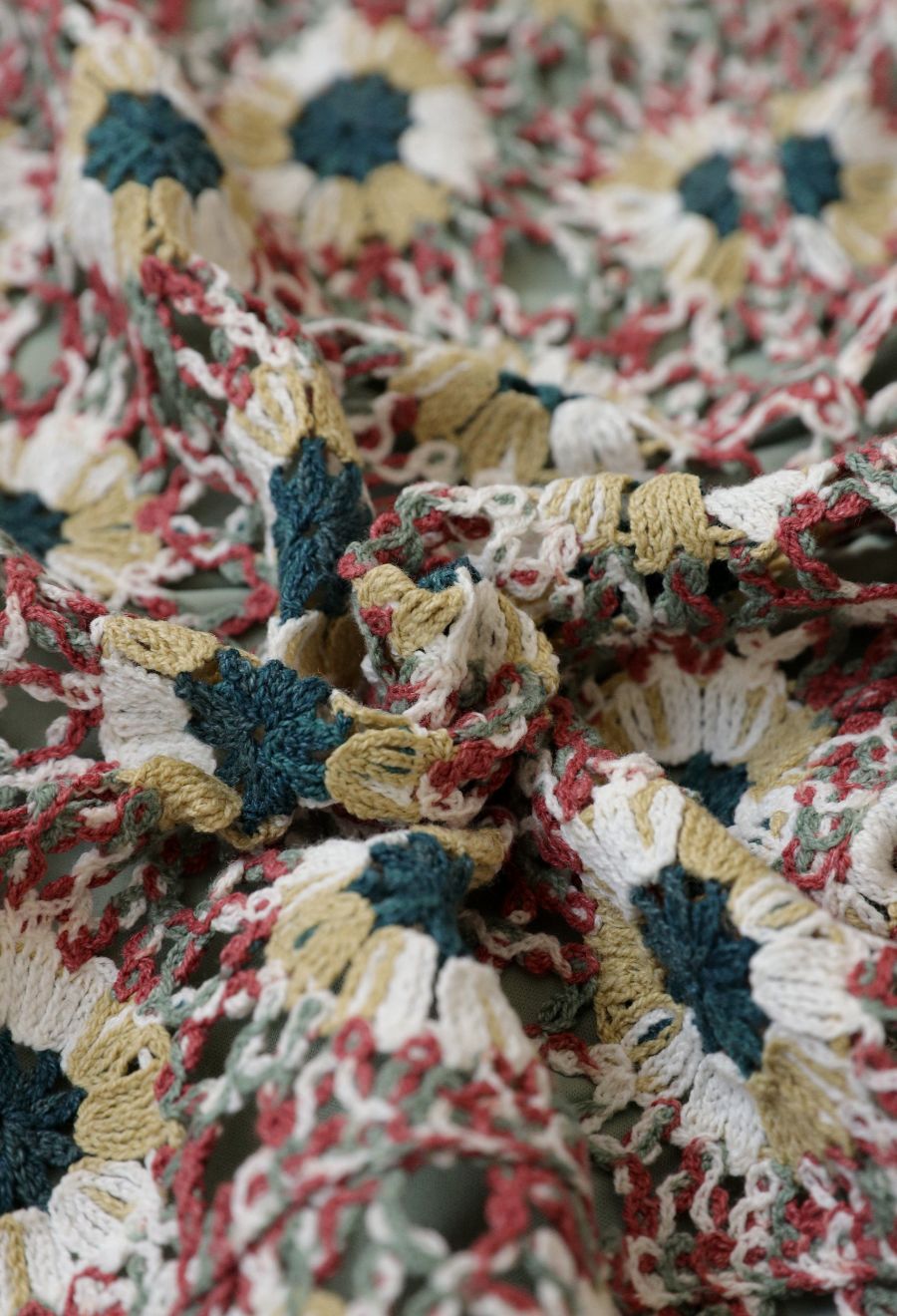 柄はかぎ針風の透かし編みで、ミックス糸の立体感が華やかな印象に。