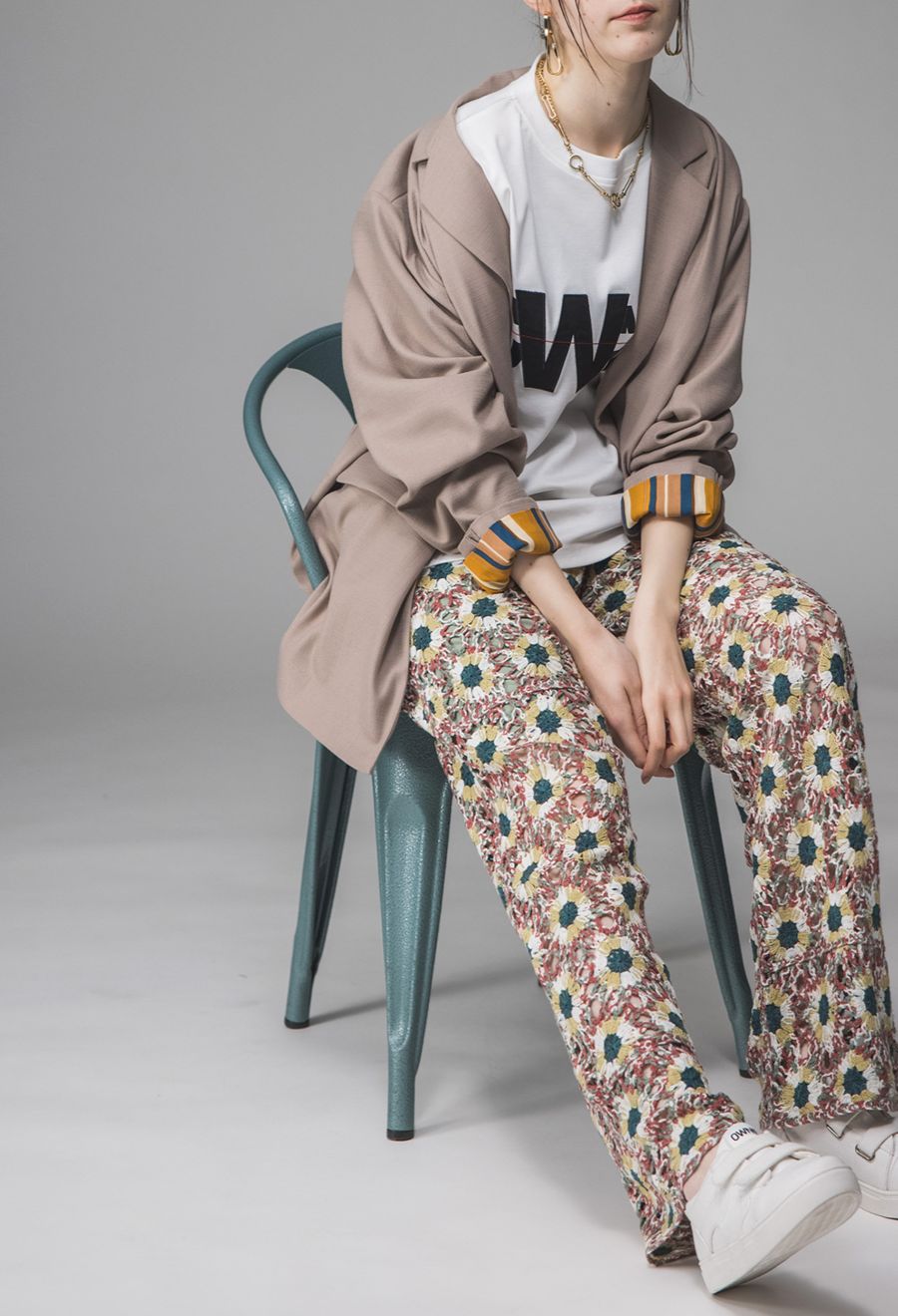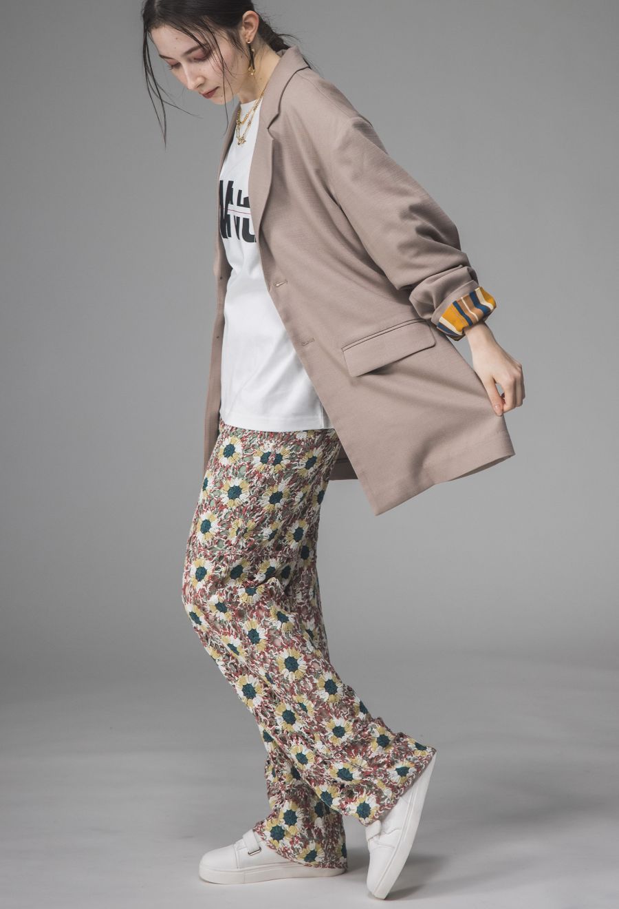 丈感は足首が少し覗くロング丈のストレートラインで、脚長効果を演出。