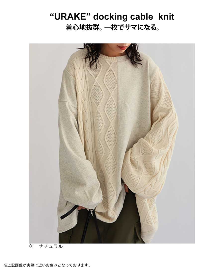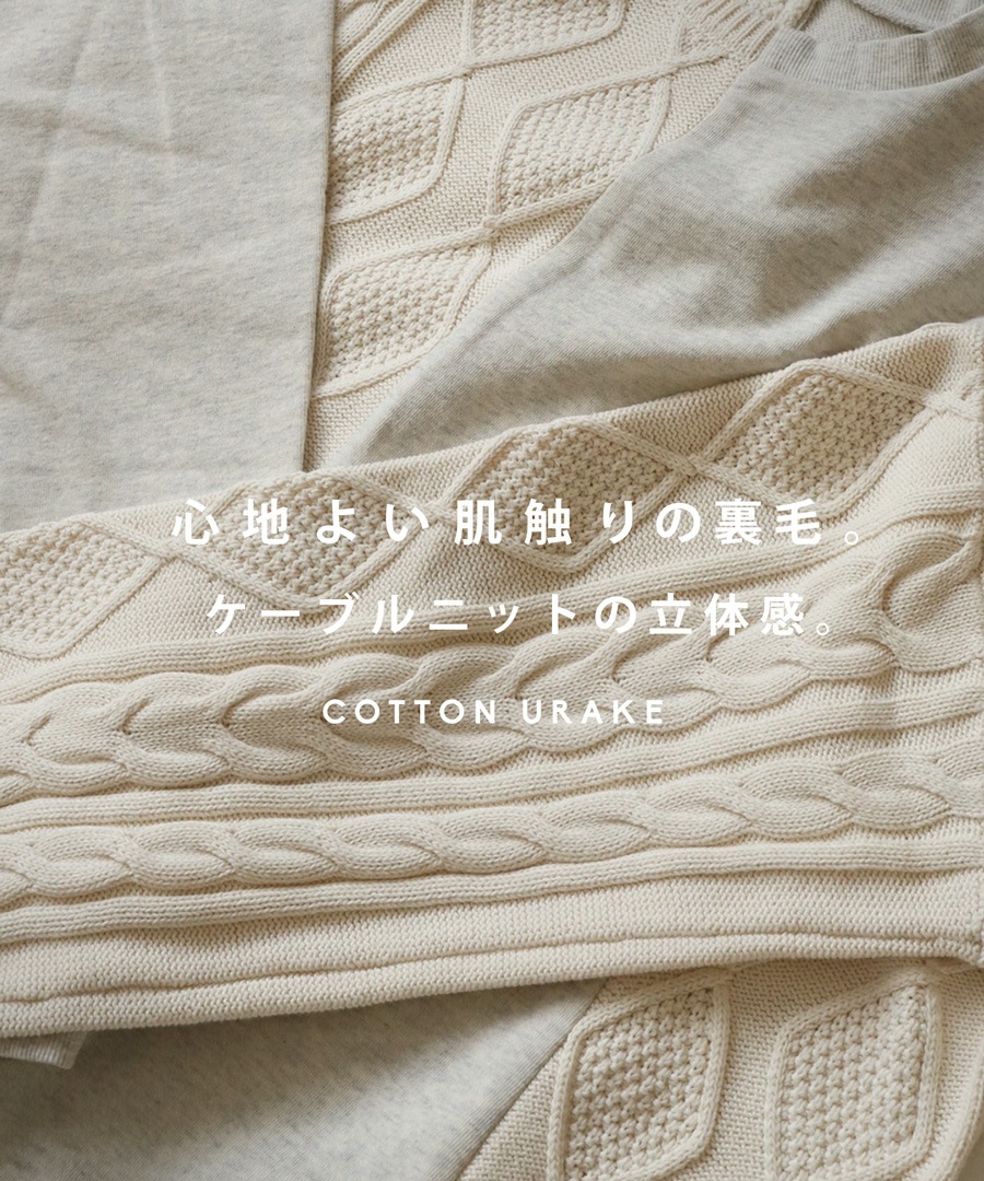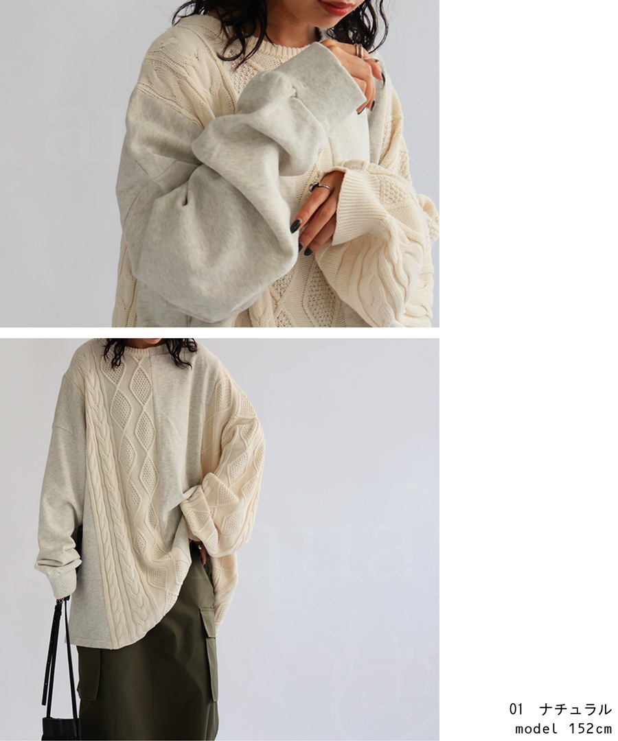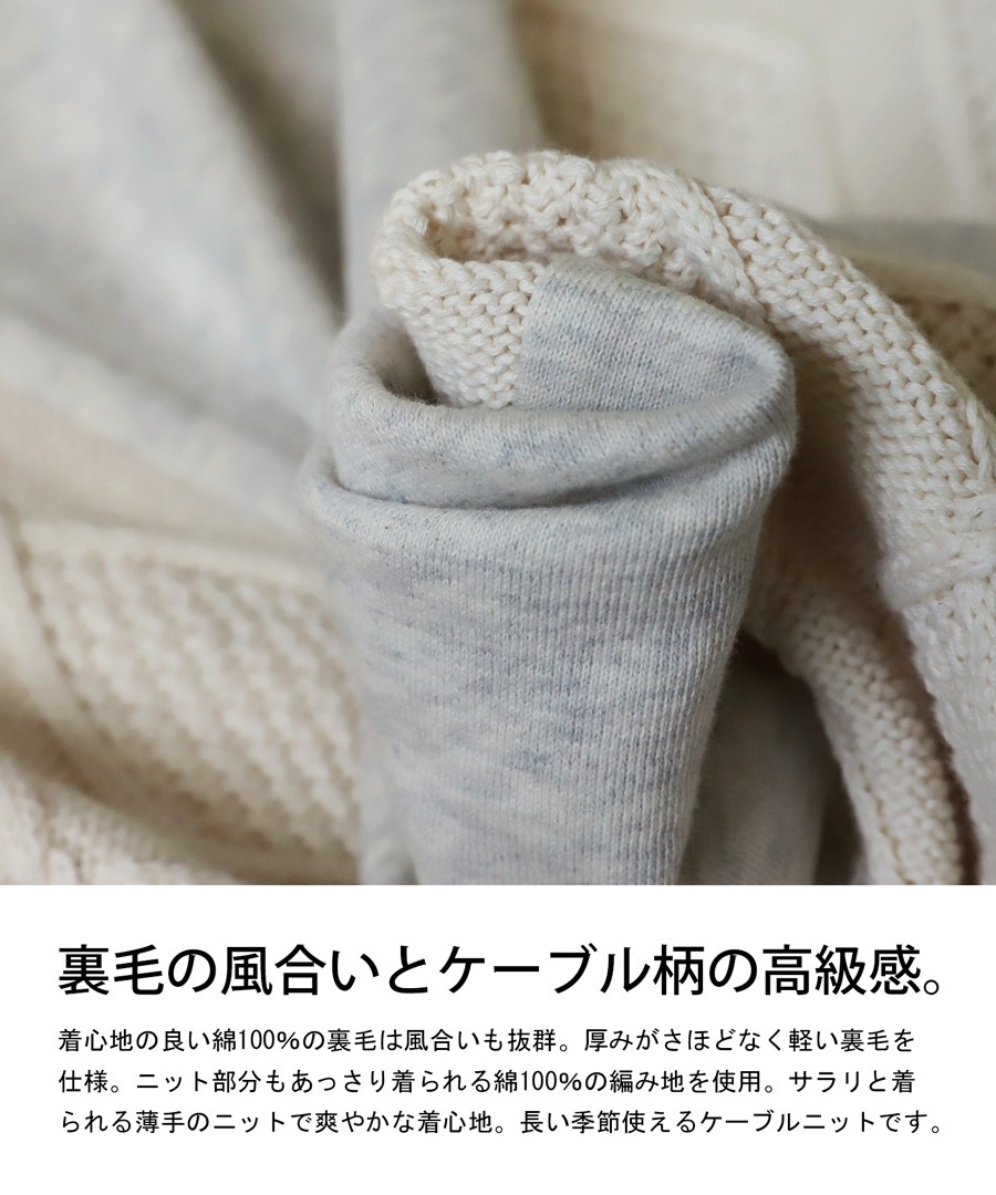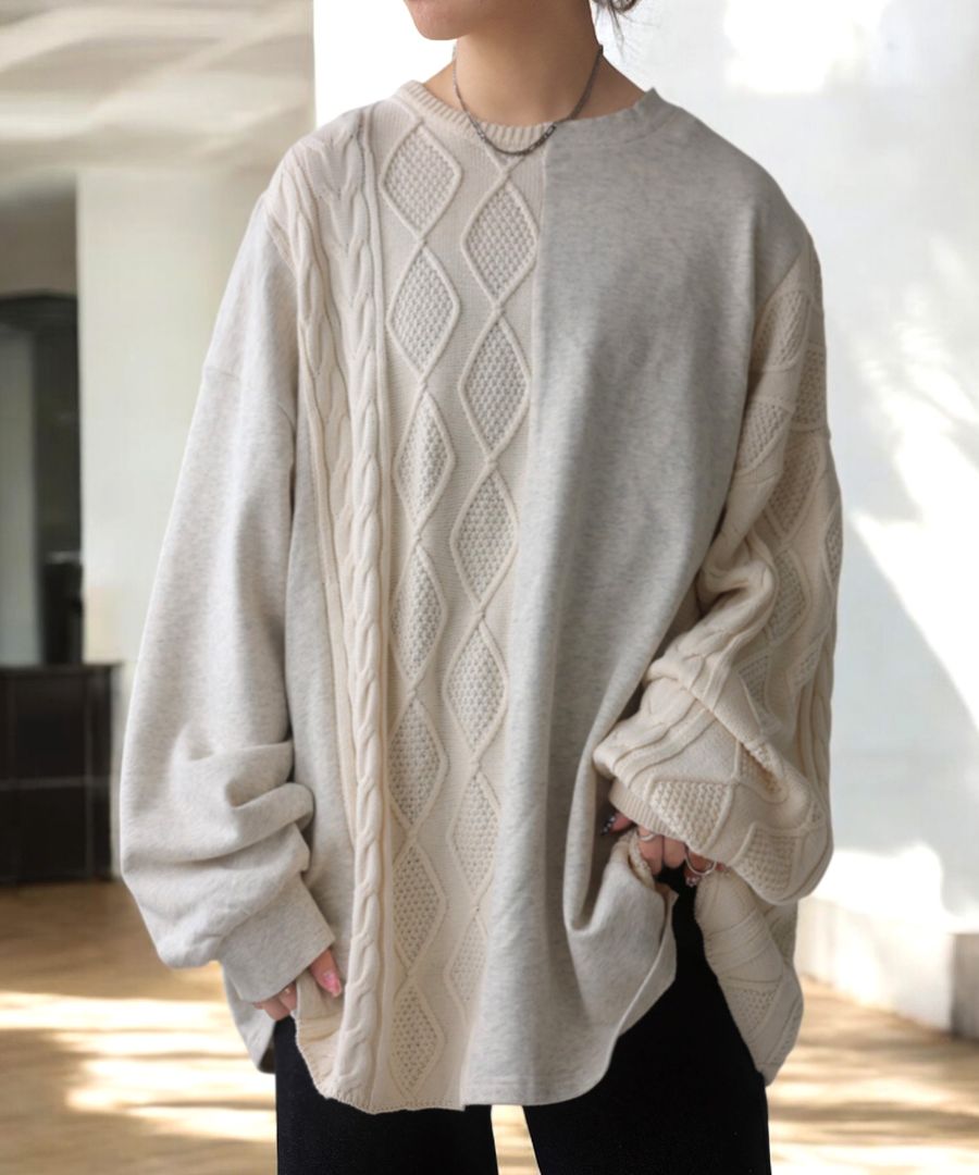 360度オシャレ!抜け感生まれる裏毛×ケーブル柄ニット。