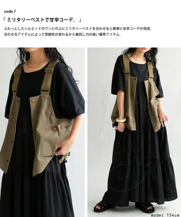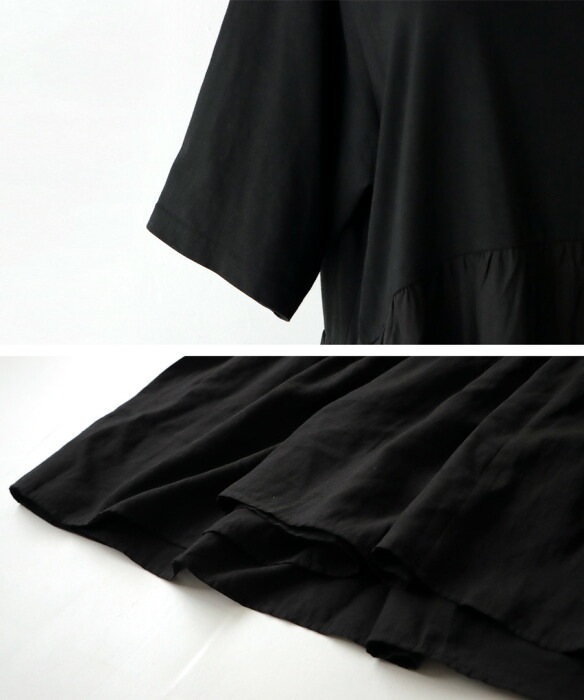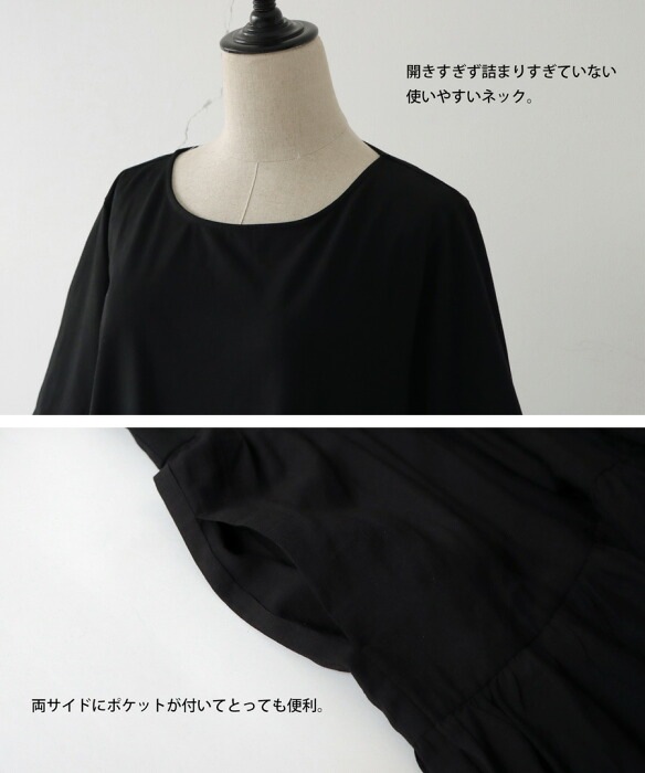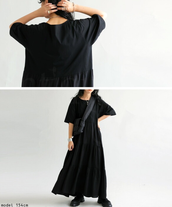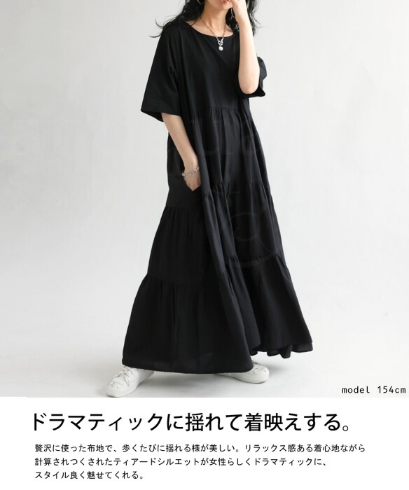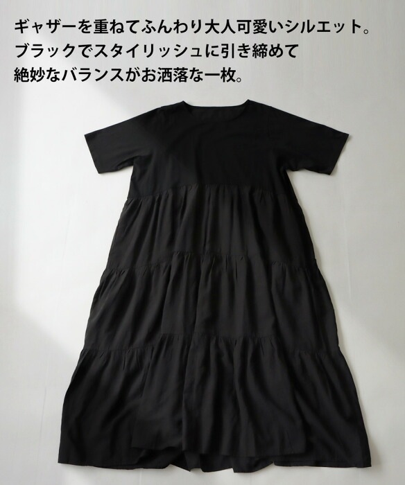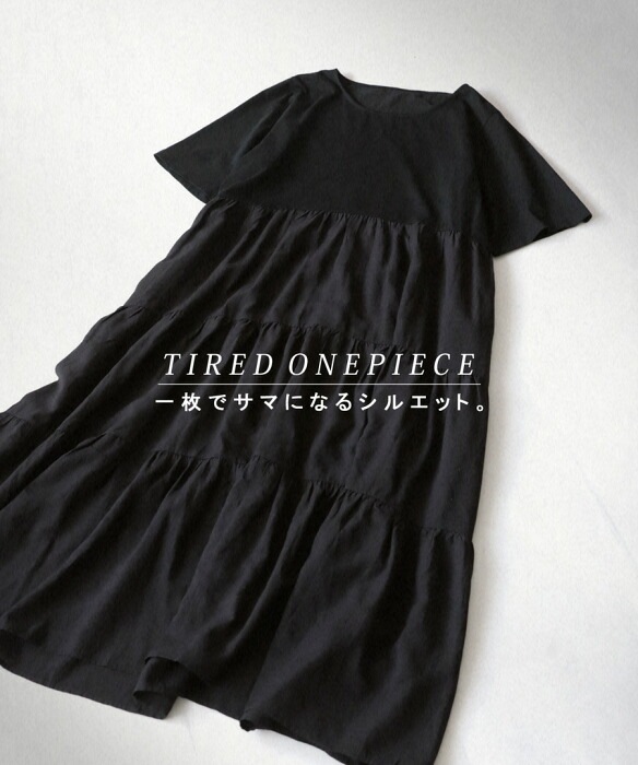ブラックの色味がモードに引き締め一枚で簡単にサマになるティアードワンピです。