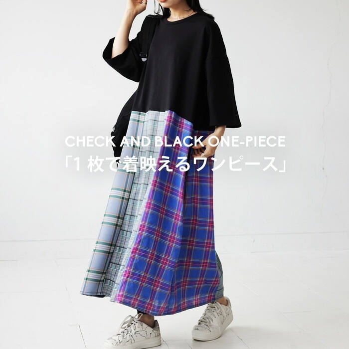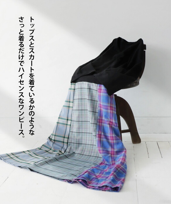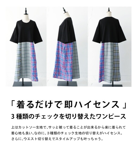 3種類のチェック生地の切り替えがハイセンスなワンピ。