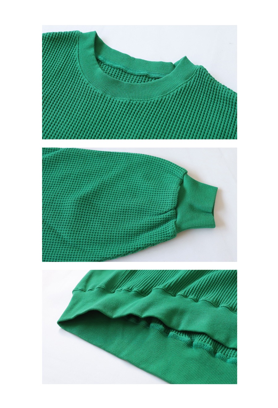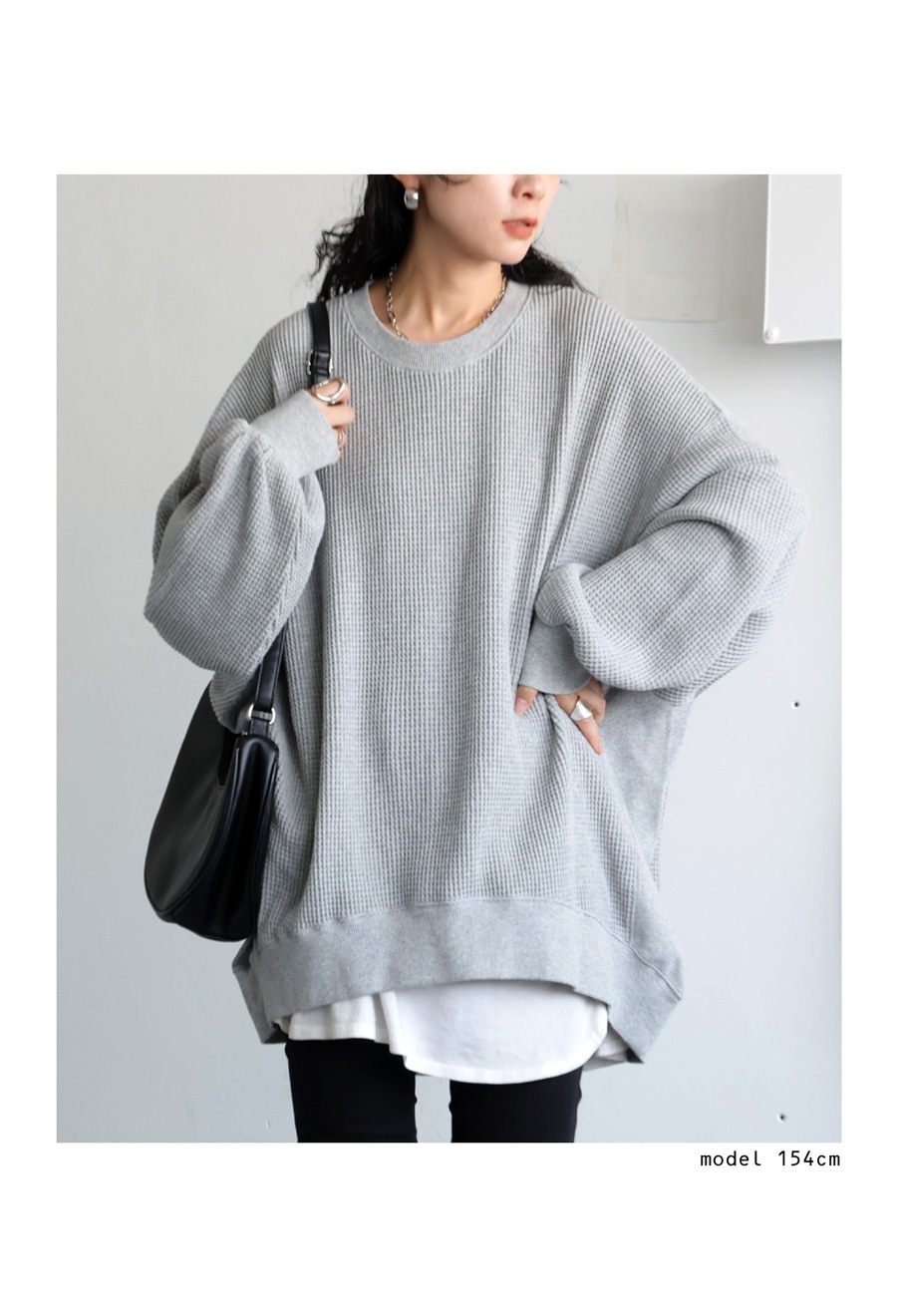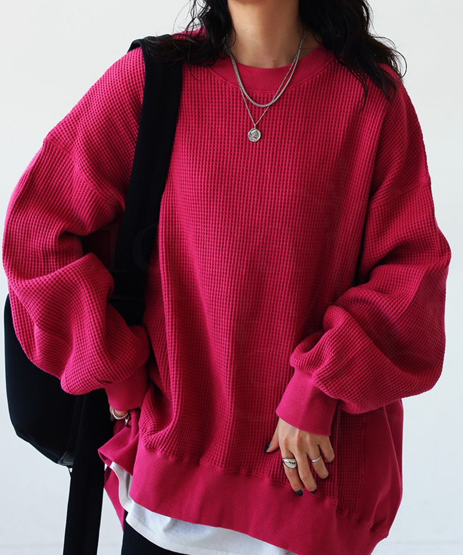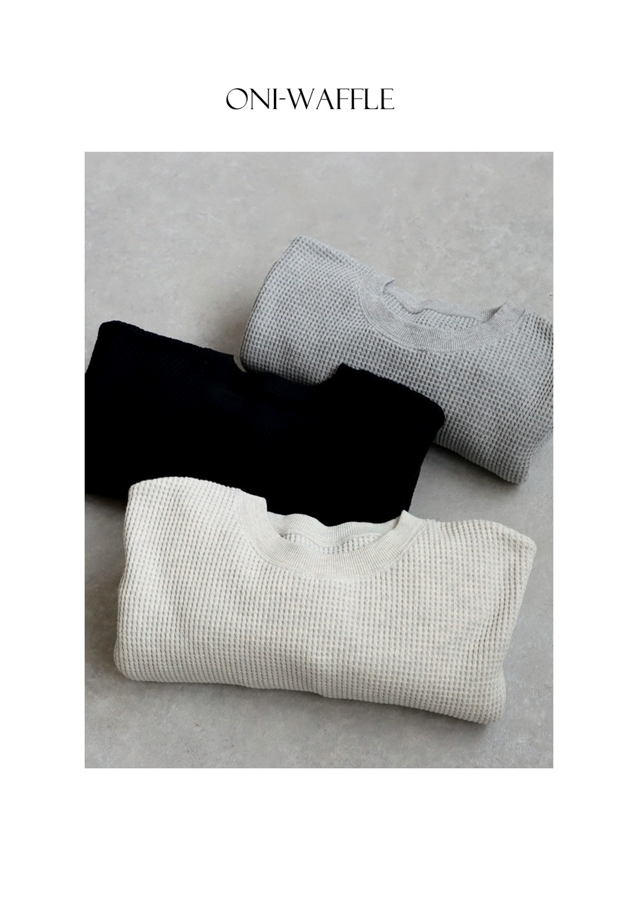 表情豊かなビッグワッフル素材を使用した、クルーネックの鬼(オニ)ワッフルプルオーバー。