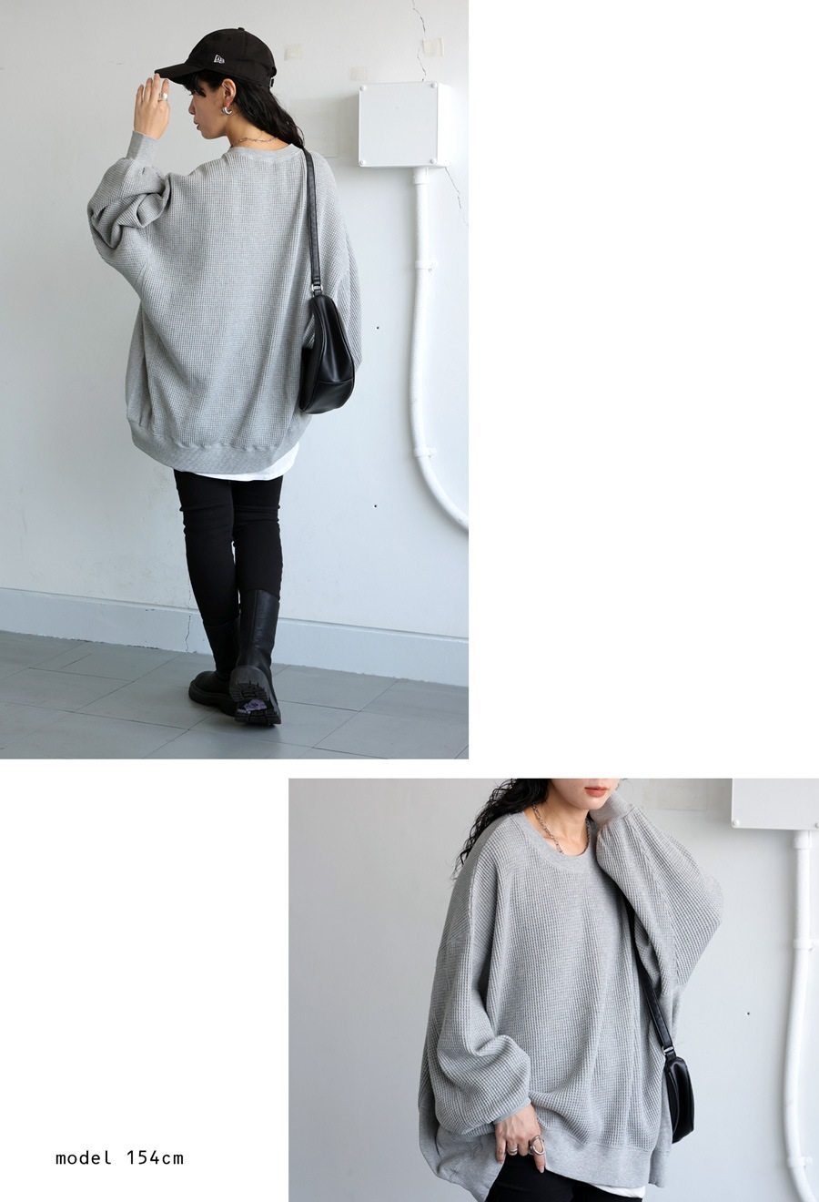 ネックラインは顔まわりをすっきり見せるベーシックな丸首で、インナーとのレイヤードもしやすい設計。