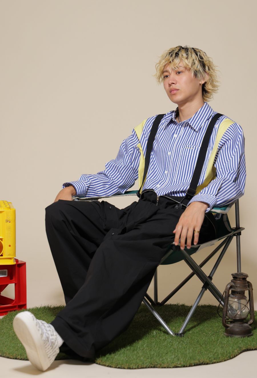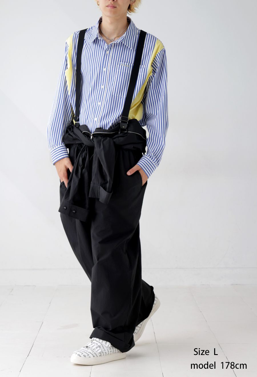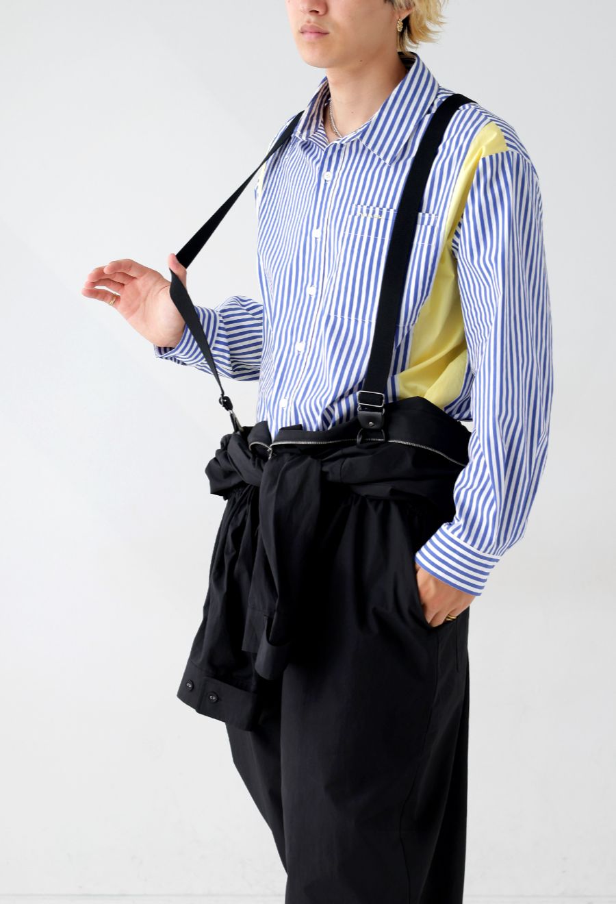 取り外し可能なボタンタイプのサスペンダーは、肩にかけても垂らしてもサマになり、着こなしの幅を広げます。