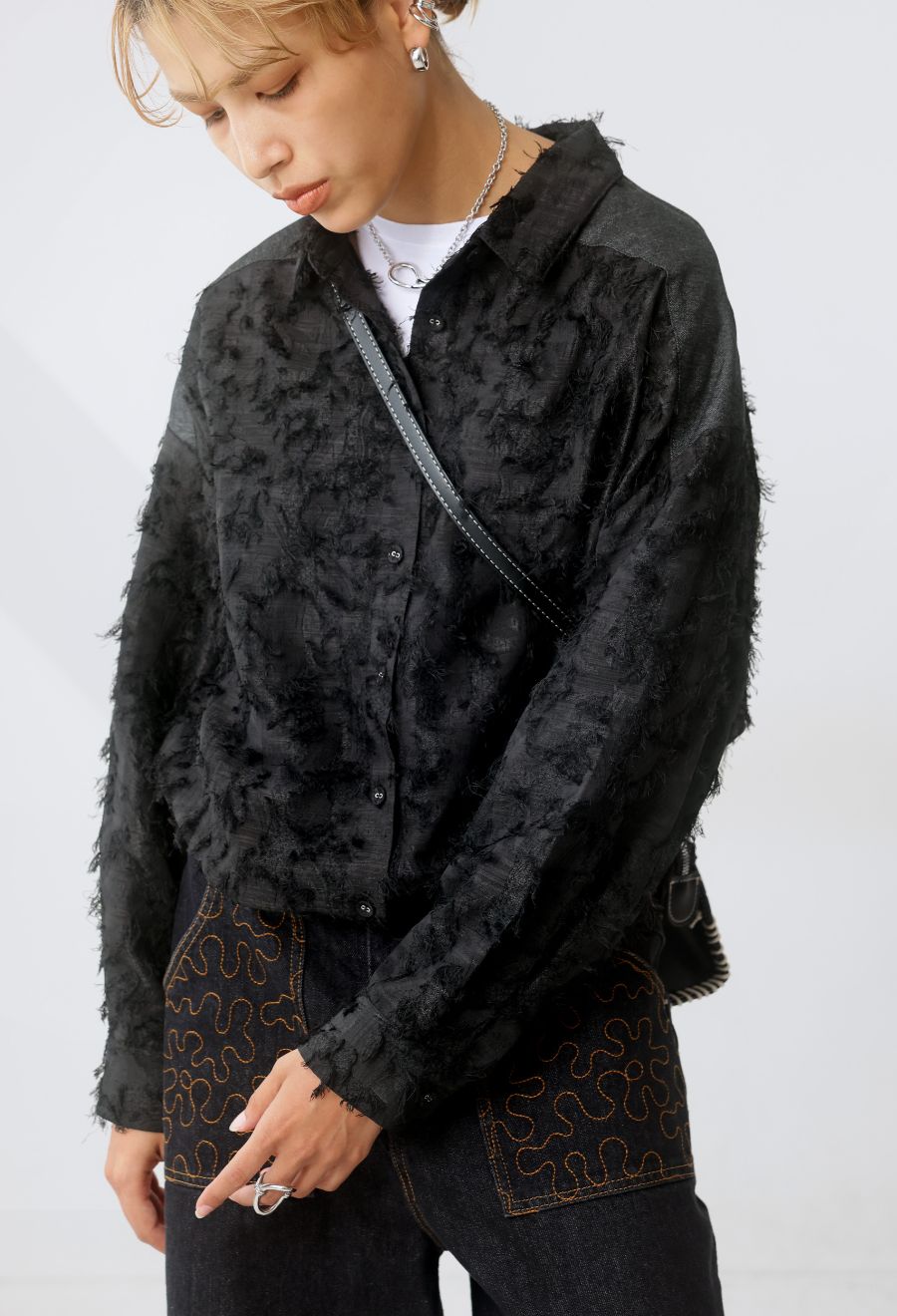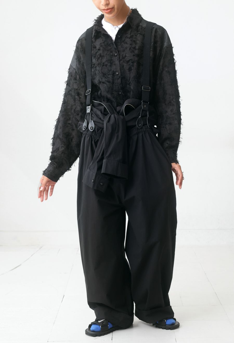 表面変化のある生地が動きに合わせて表情をつくり、きれいめにもカジュアルにも馴染みます。
