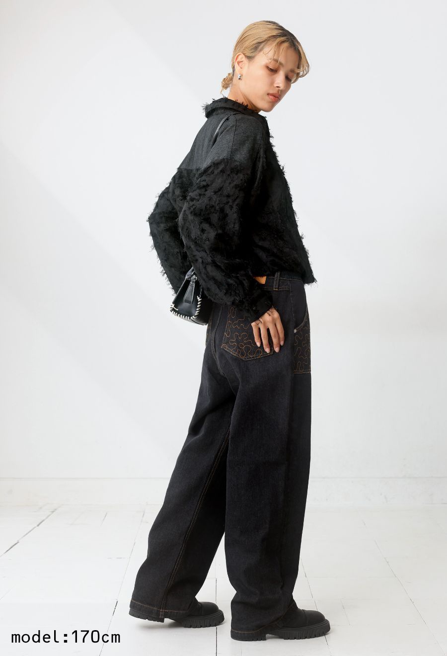 背面はヨーク切替でさりげなくメリハリをプラス。デニムの質感がコーデにモードなニュアンスを添えます。