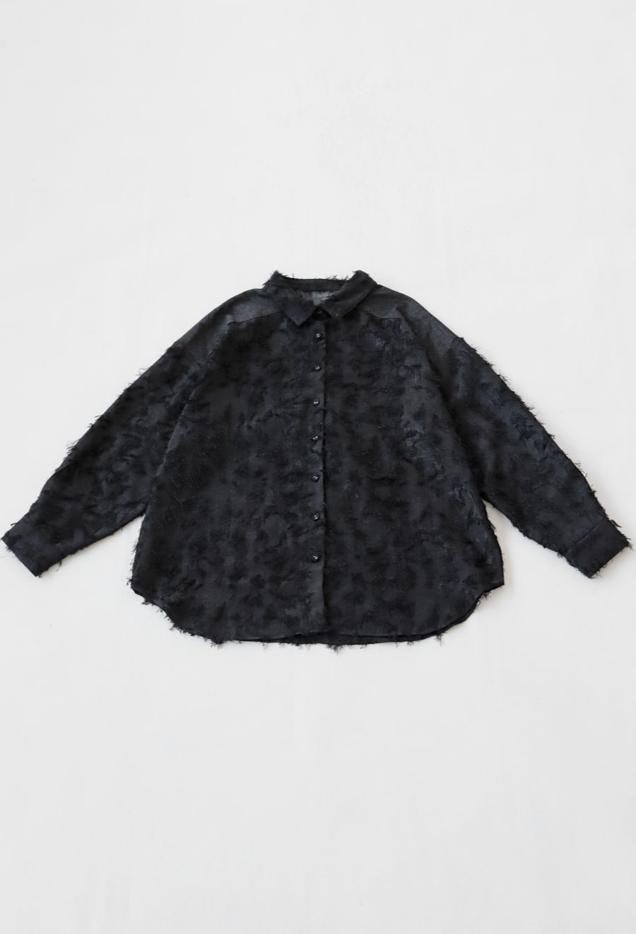 ネックラインはレギュラー襟、袖丈は長袖。ゆとりのあるドロップショルダーで、ラウンドヘムが軽さを演出します。