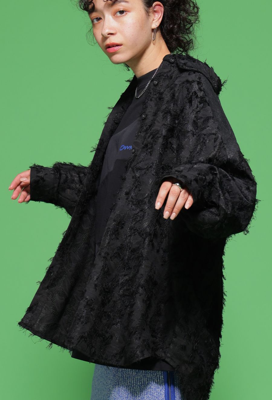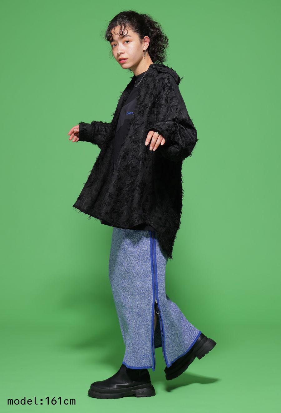 丈感はヒップを自然にカバーするロング寄りの設定。前開きのボタン仕様で、羽織りとしても使いやすい設計です。