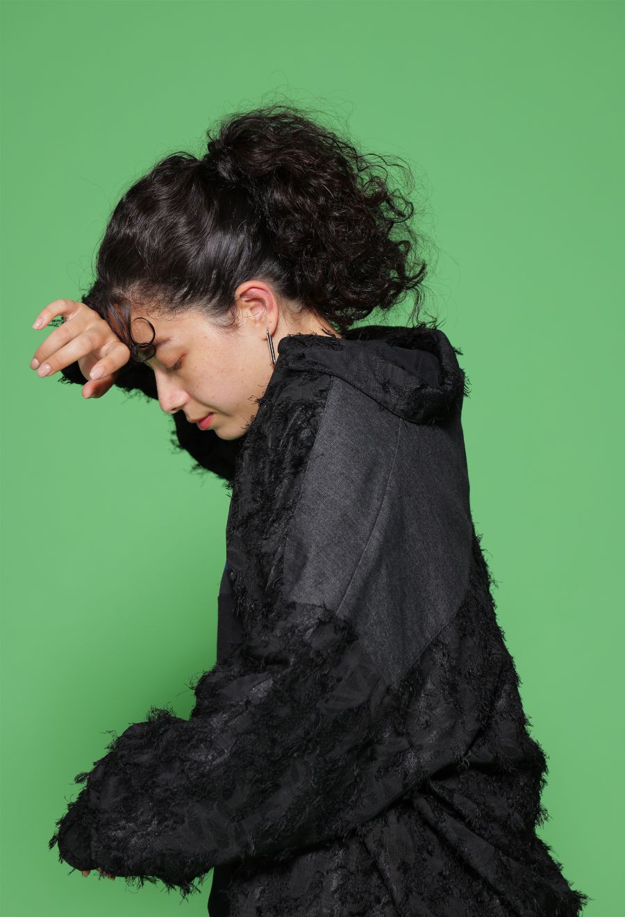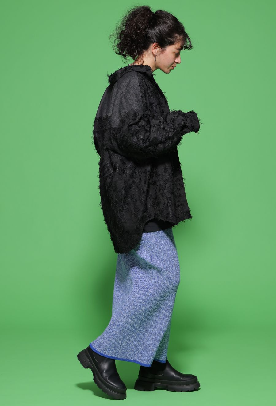 立体感のあるフリンジジャガードを主役に、デニム切替で奥行きを出した一枚です。