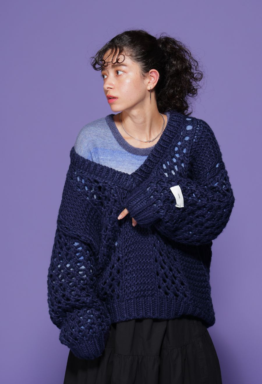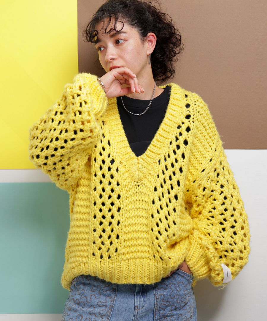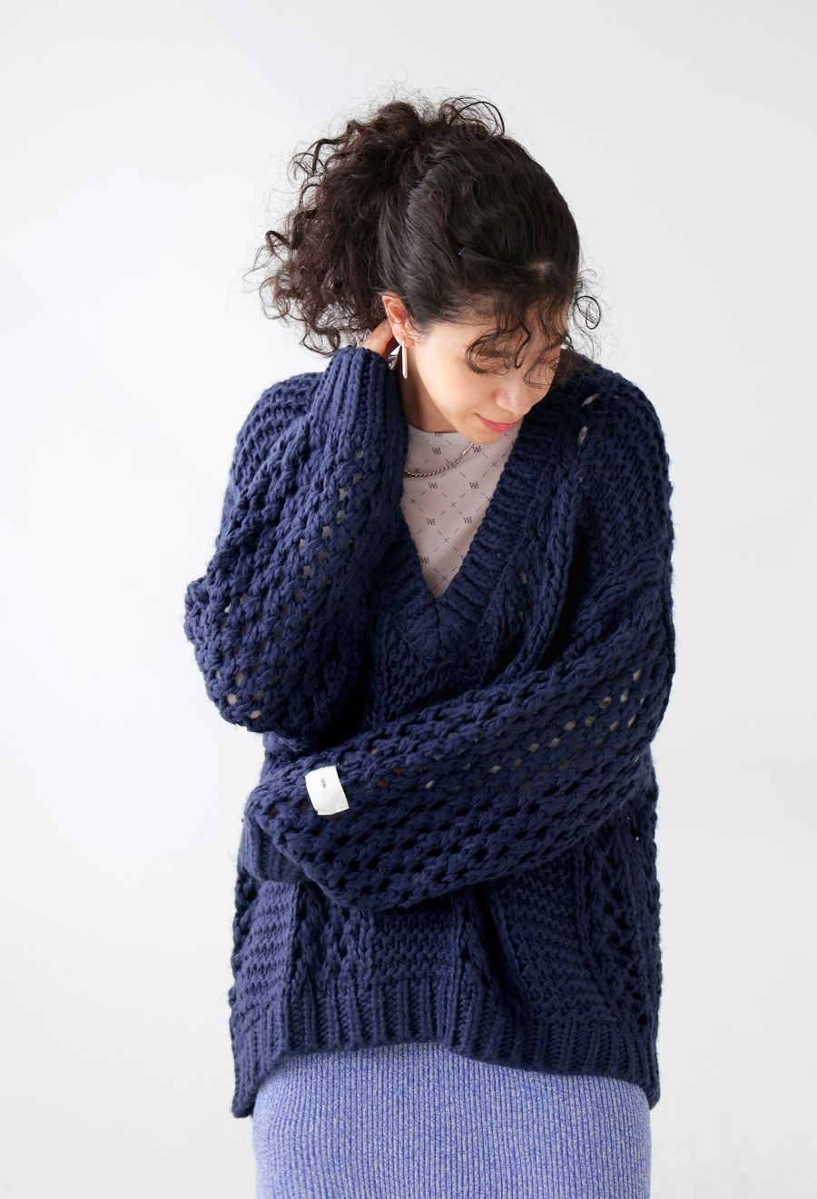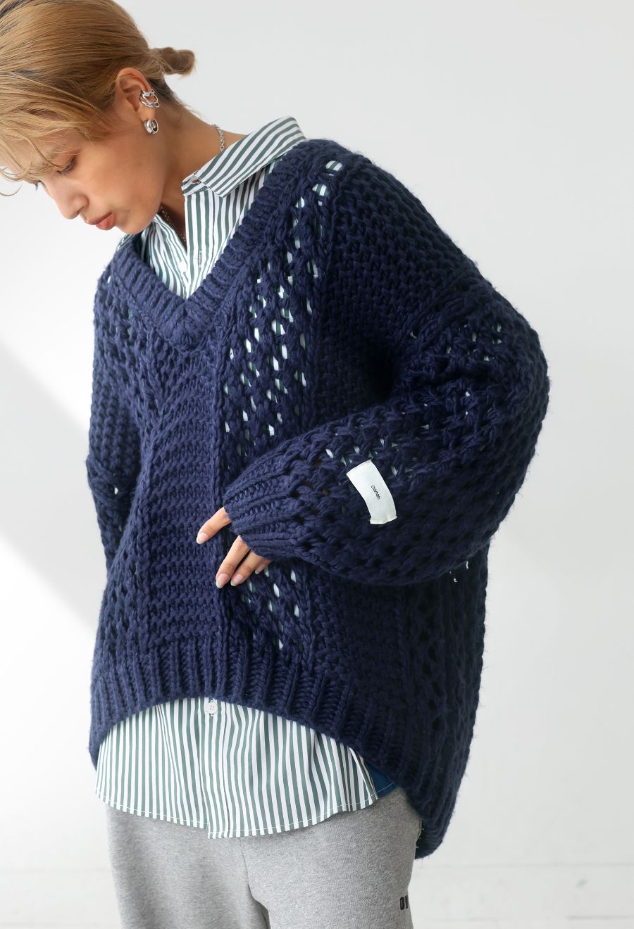 ふっくらとしたロービング糸を、メッシュ編みとガーター編みの2種類で仕上げた、手編みのような温かみと存在感が魅力のVネックニットです。