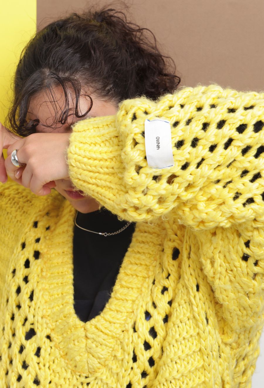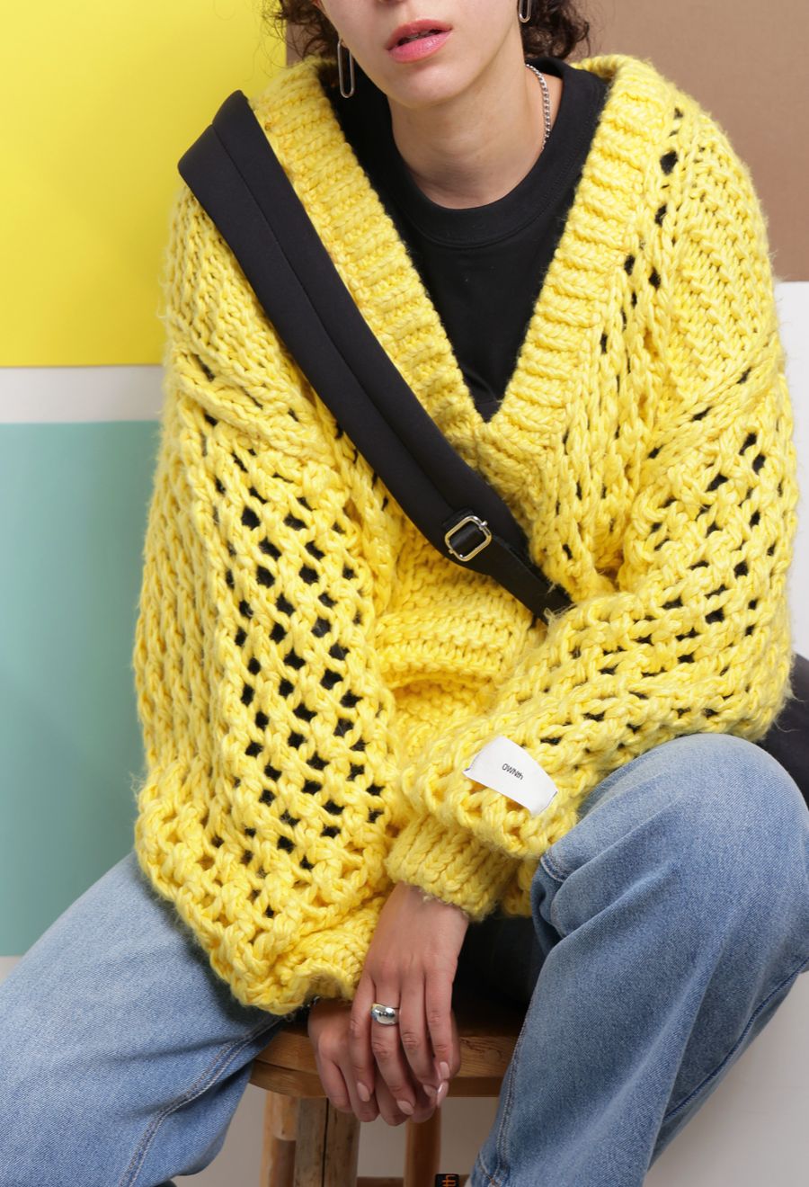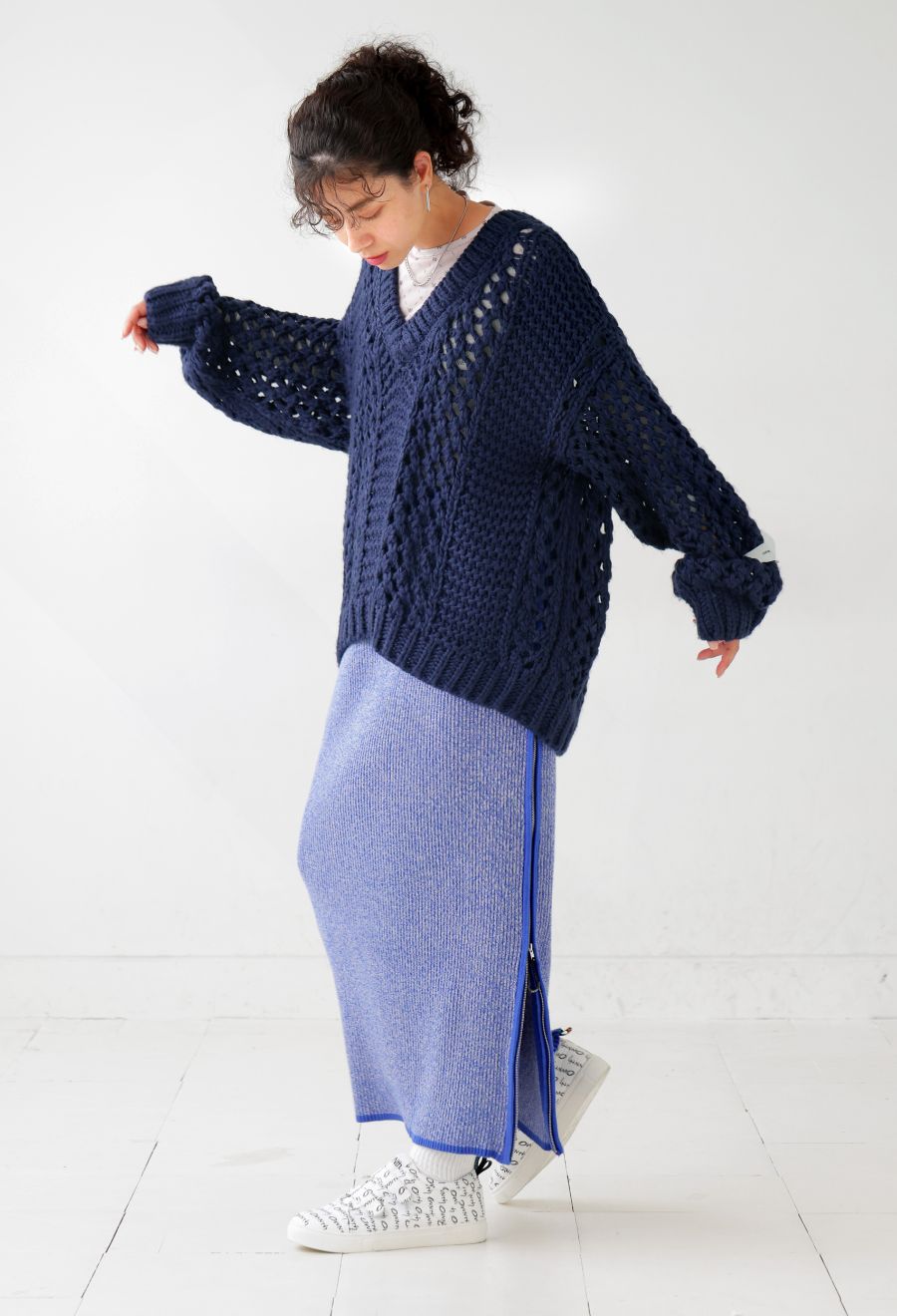 ふっくらとしたロービング糸を、メッシュ編みとガーター編みの2種類で仕上げた、手編みのような温かみと存在感が魅力のVネックニットです。