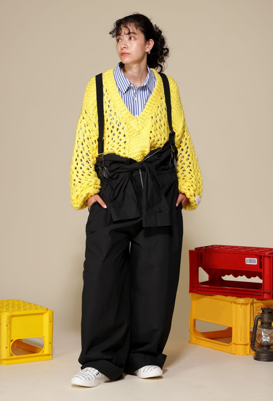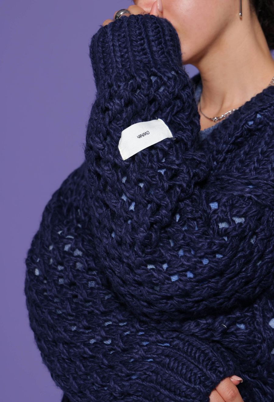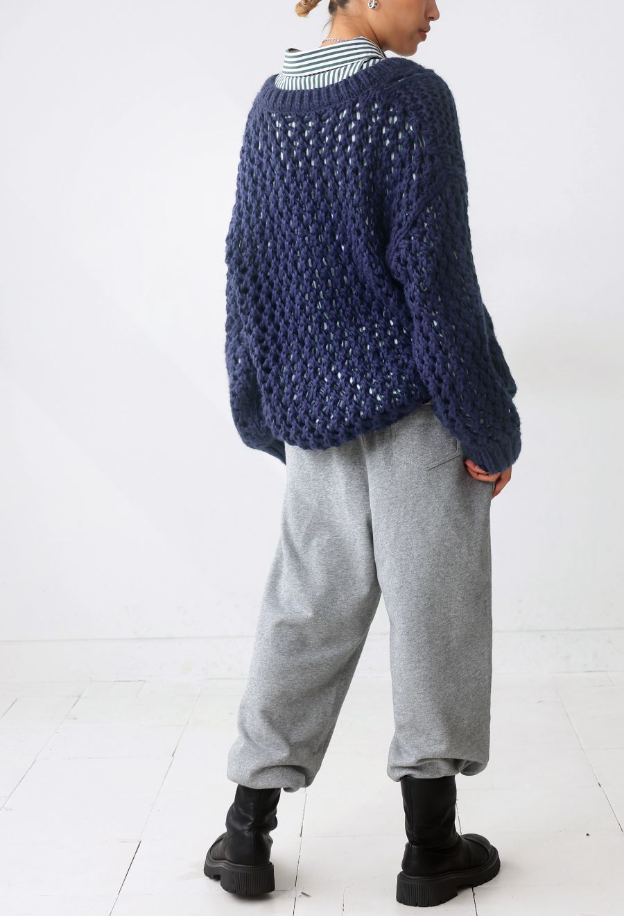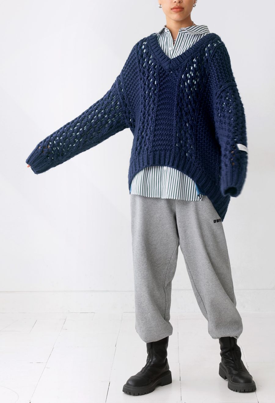 ふっくらとしたロービング糸を、メッシュ編みとガーター編みの2種類で仕上げた、手編みのような温かみと存在感が魅力のVネックニットです。