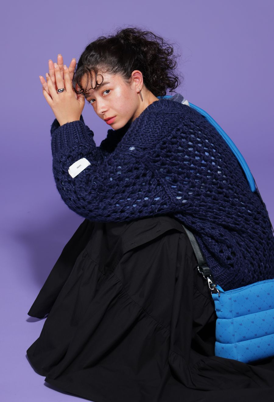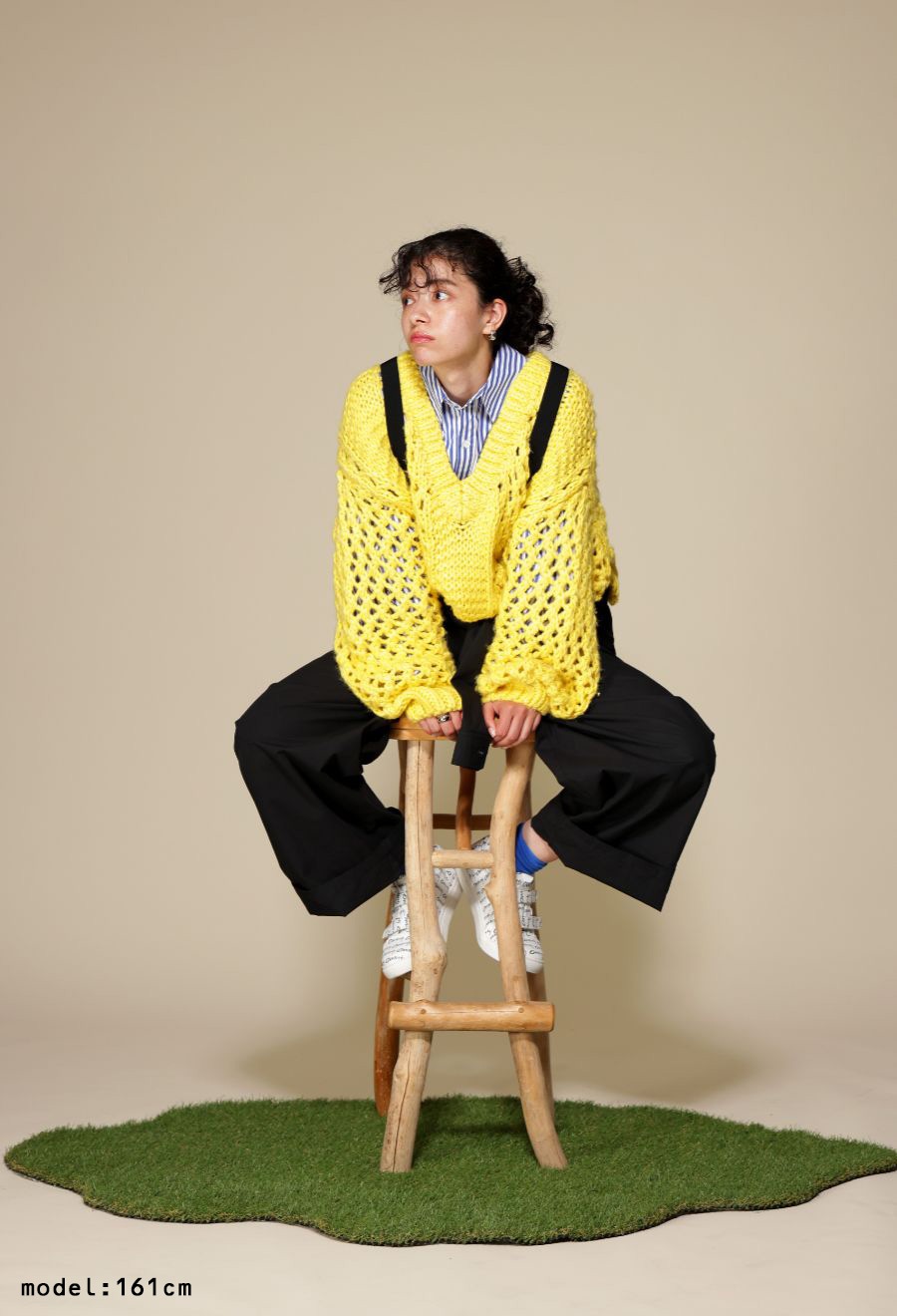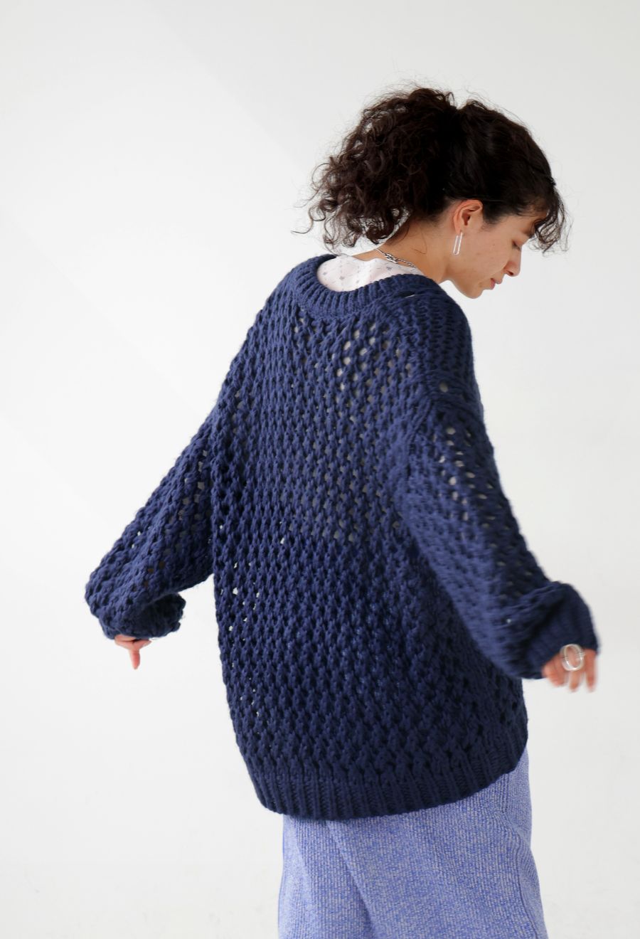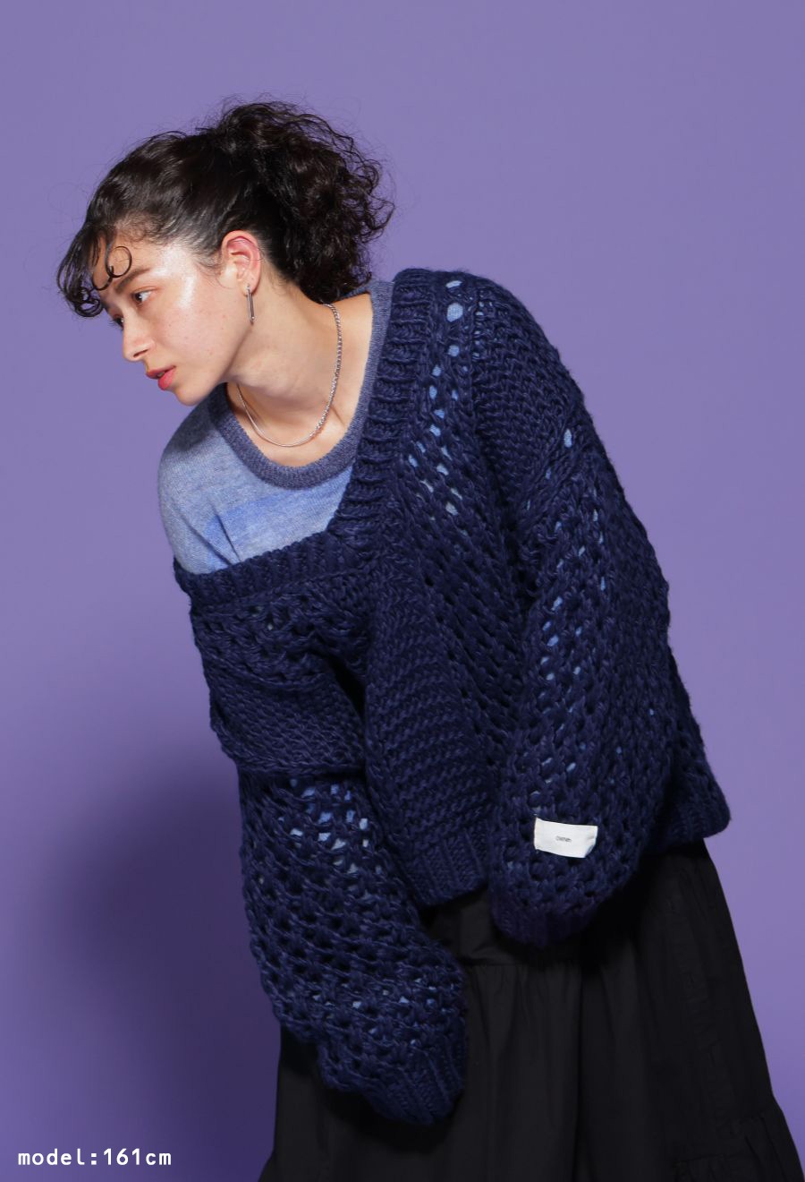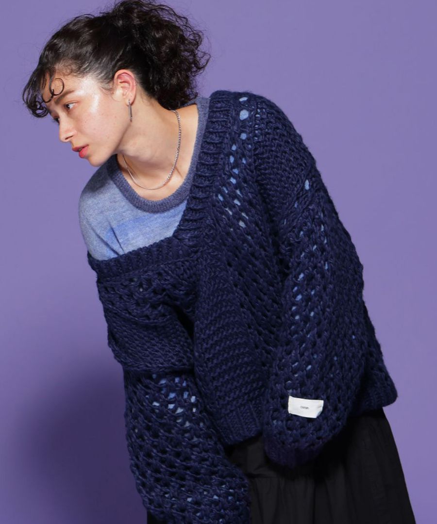 透かし編みならではの抜け感が軽やかさを演出し、インナーとのレイヤードも楽しめるデザイン。