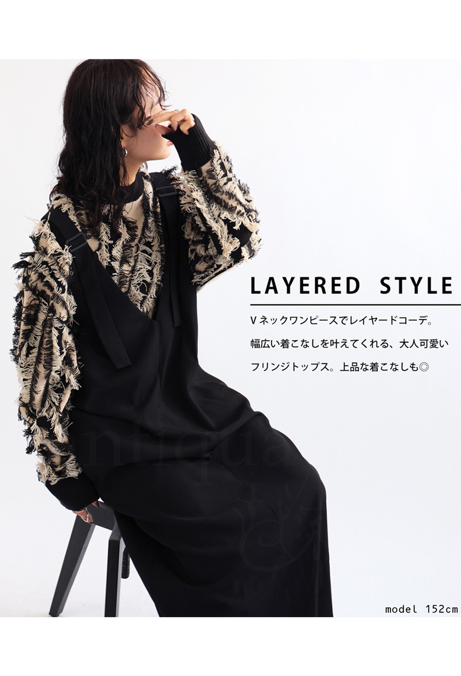 全体に施されたフリンジが視線を引きつける主役級ニットトップスです。