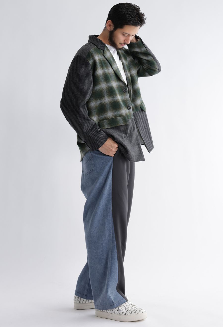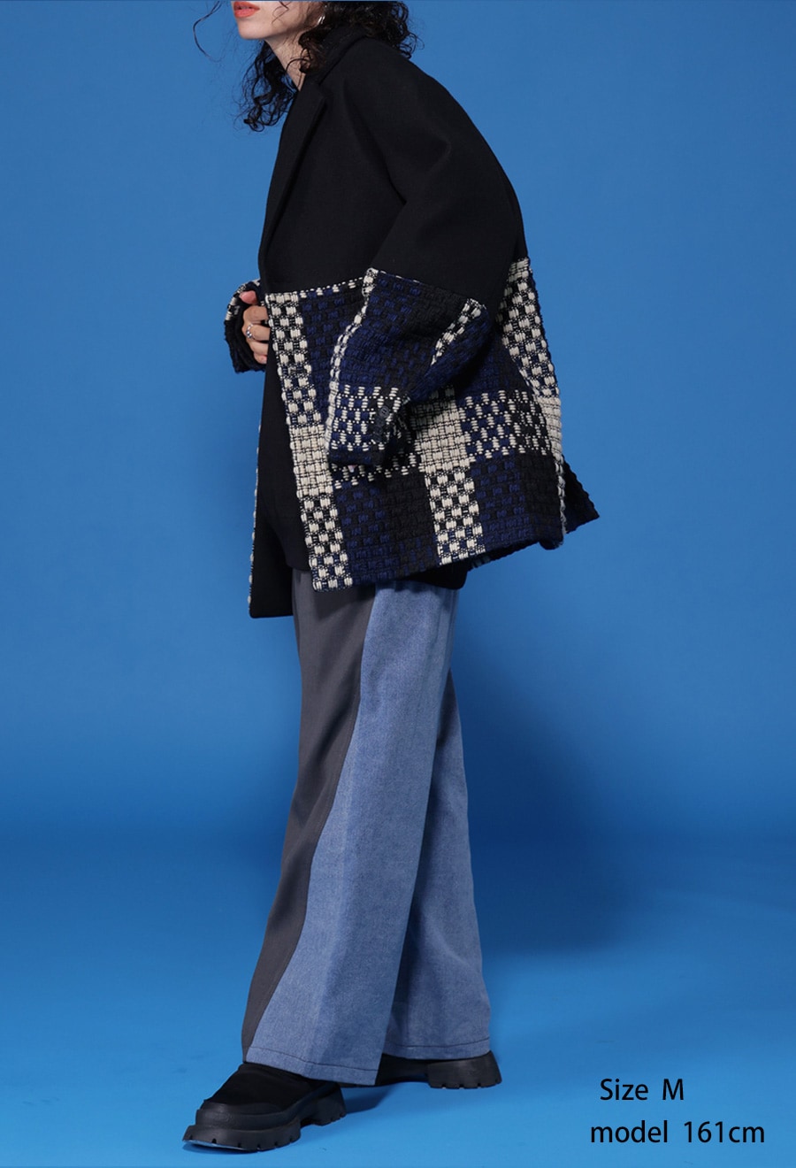 落ち感のあるポリエステル混ツイルと程よい厚みのデニム素材を使用し、異素材の質感も楽しめます。