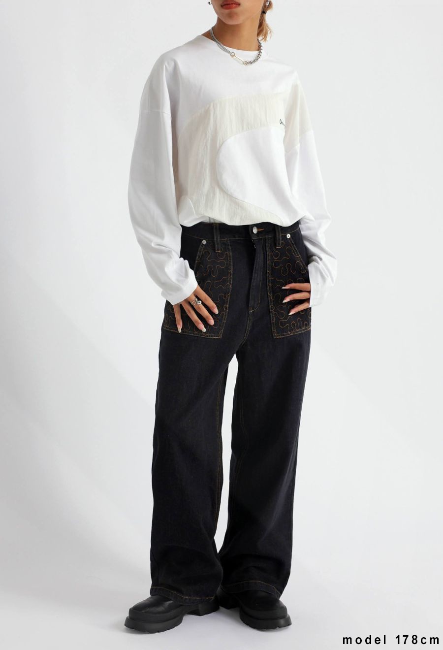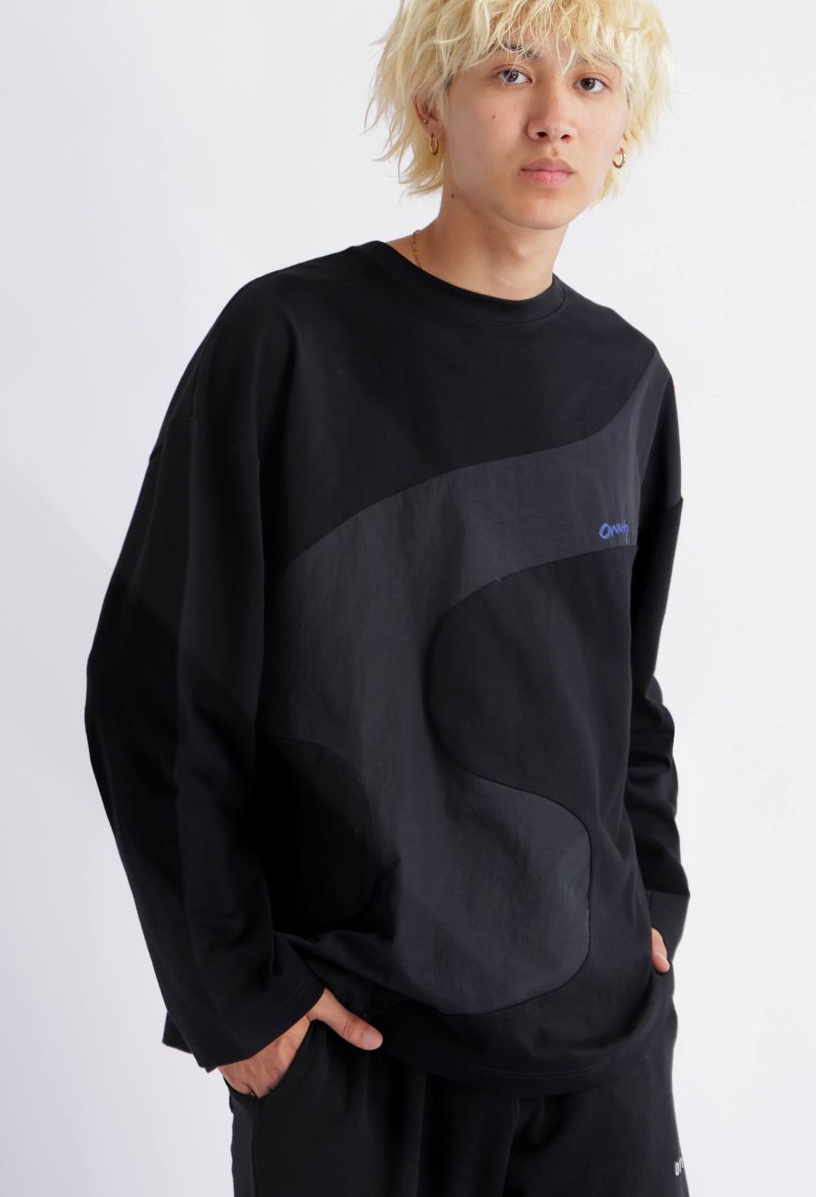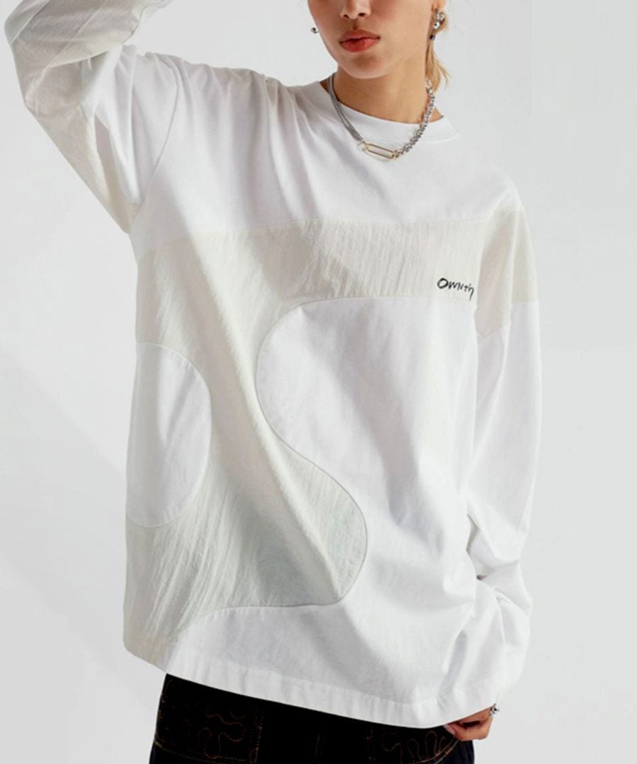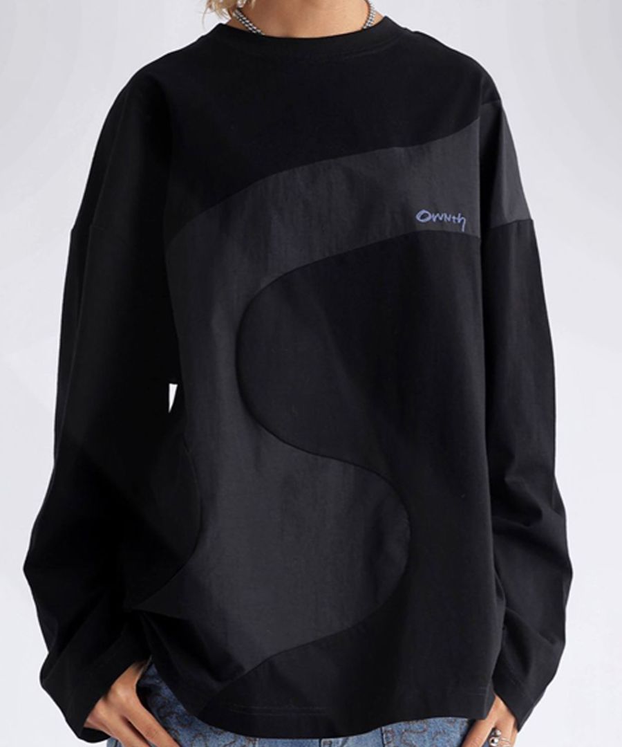 大胆なウェーブラインが印象的な、異素材ドッキングのロングスリーブTシャツ。
