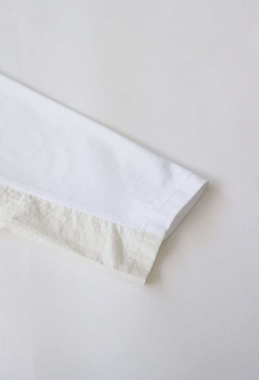 綿100%のしっかりとした天竺生地に、軽やかなナイロン素材を組み合わせた、表情豊かな1枚です。
