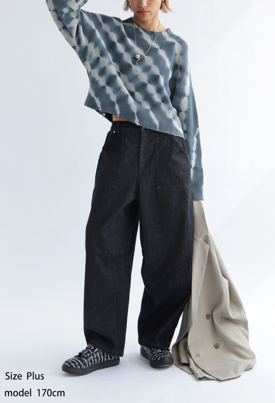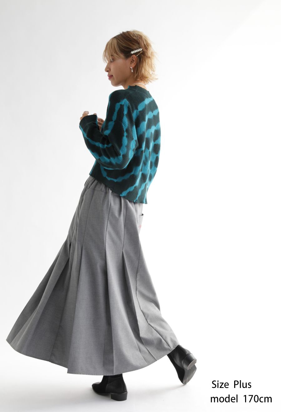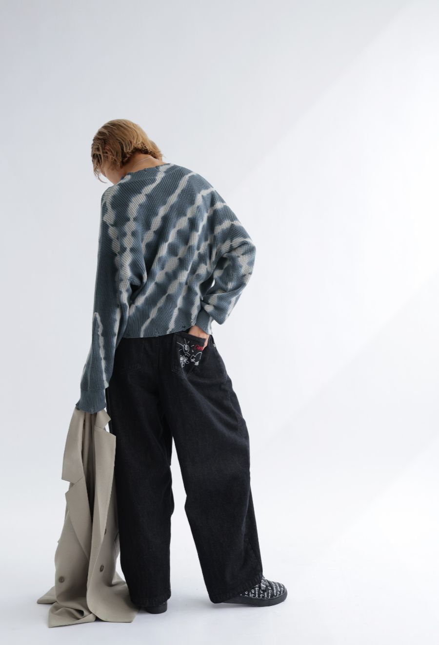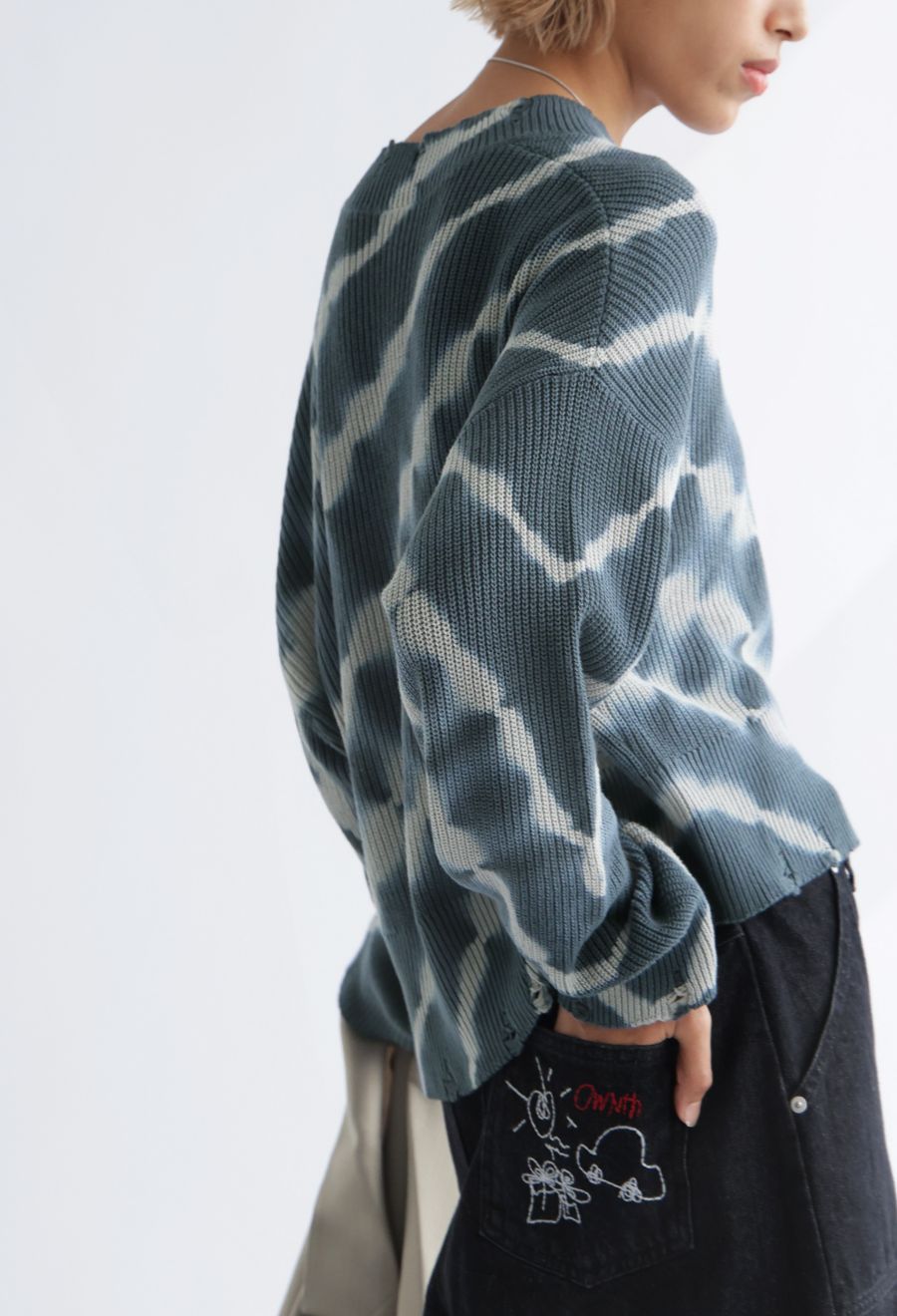 柄は印象的なタイダイ柄(タイダイ・絞り・Tie-dye)で、スタイリングに個性をプラス。