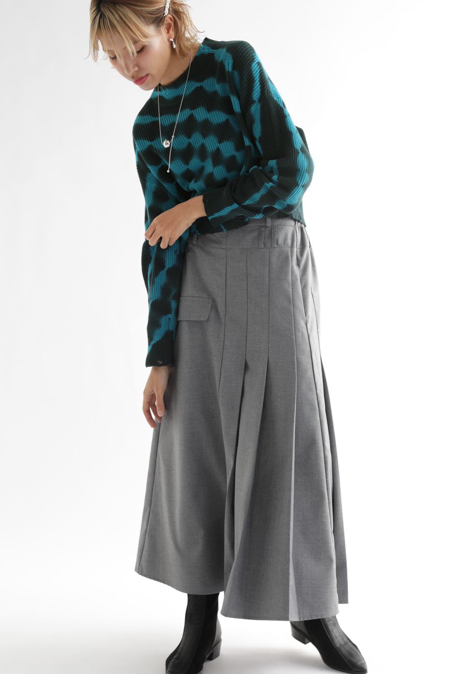 丈感はトレンドのショート丈で、ハイウエストボトムとの相性も抜群です。