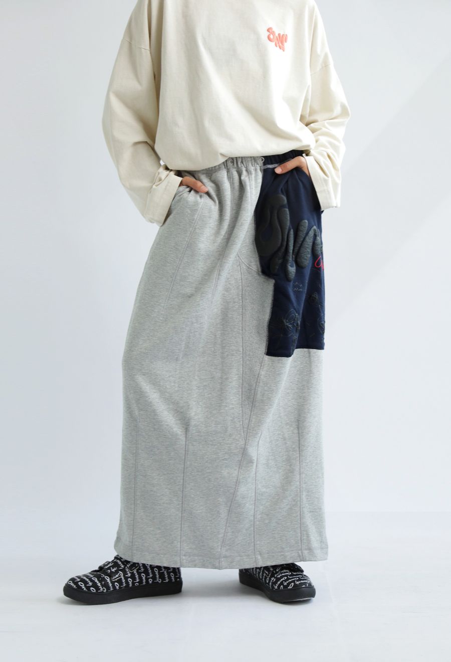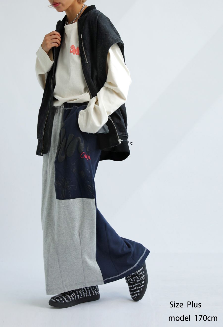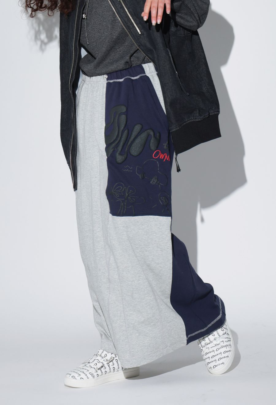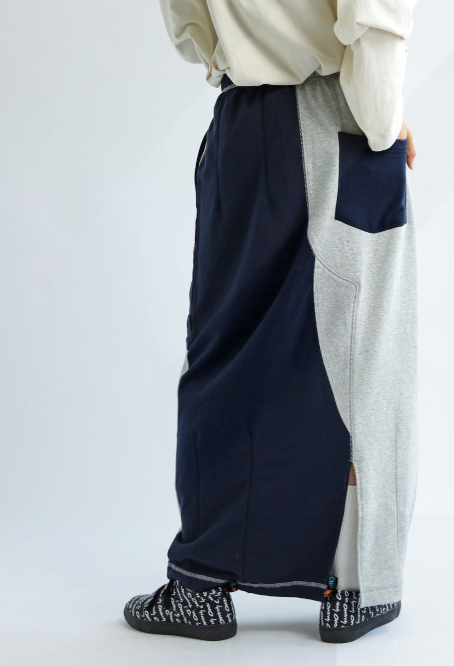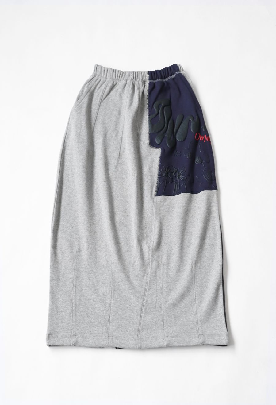 大胆な前後切替とロゴデザインが目を引く、OWNthの裏毛ロングスカート。